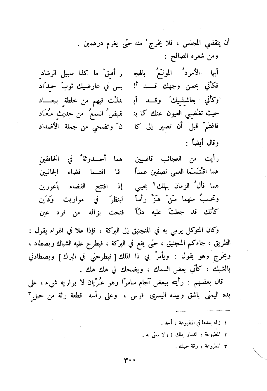 كأنك قد جعلت عليه دناً ... فتحت بزاله من فرد عين وكان المتوكل يرمي به في المنجنيق إلى البركة، فإذا علا في الهواء يقول: الطريق، جاءكم المنجنيق، حتى يقع في البركة، فيطرح عليه الشباك ويصطاد، ويخرج وهو يقول: ويأمر بي ذا الملك " فيطرحوني في البرك " ويصطادني بالشبك، كأني بعض السمك، ويضحك لي هك هك.