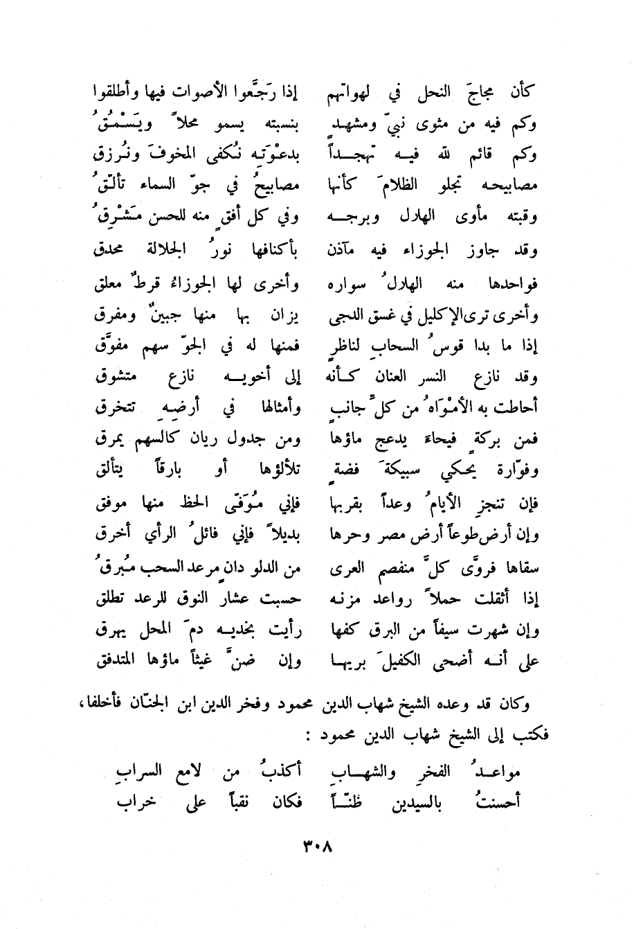 على أنه أضحى الكفيل بريها ... وإن ضن غيثاً ماؤها المتدفق وكان قد وعده الشيخ شهاب الدين محمود وفخر الدين ابن الجنان فأخلفا، فكتب إلى الشيخ شهاب الدين محمود:
