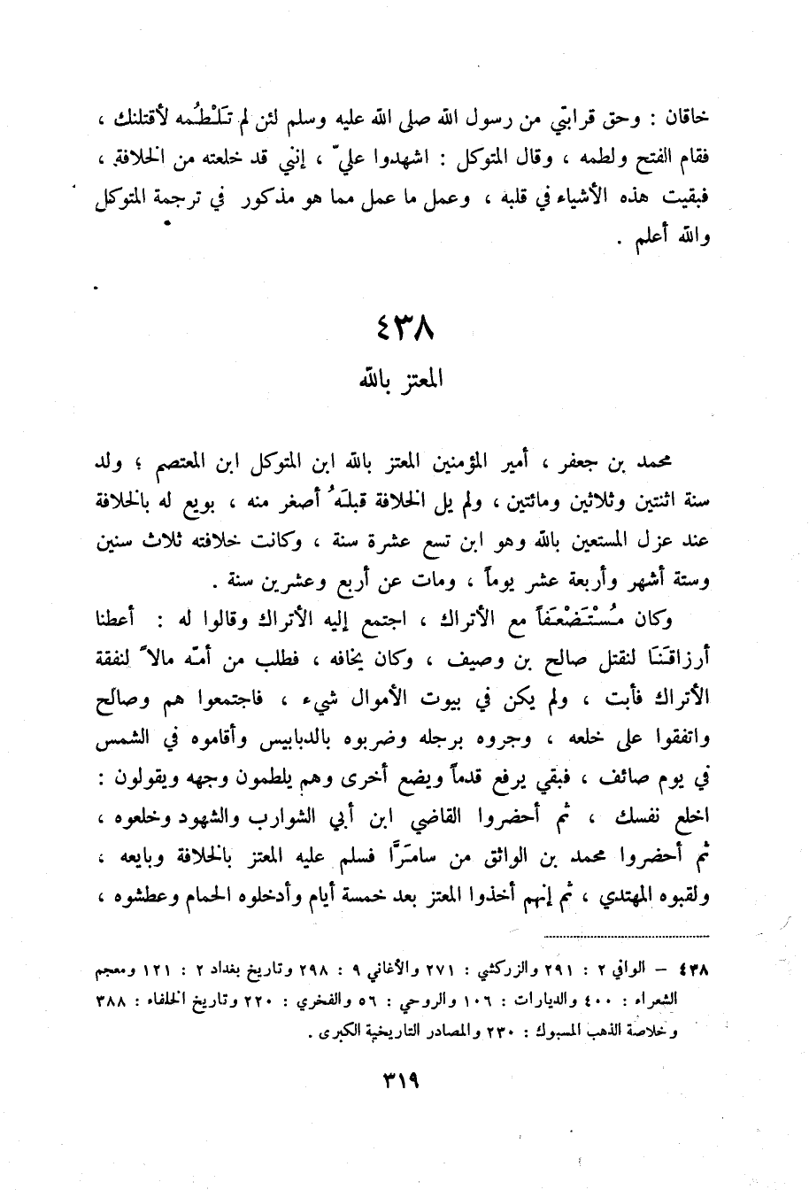 (1) الوافي 2: 291 والزركشي: 271 والأغاني 9: 298 وتاريخ بغداد 2: 121 ومعجم الشعراء: 400 والديارات: 106 والروحي: 56 والفخري: 220 وتاريخ الخلفاء: 388 وخلاصة الذهب المسبوك: 230 والمصارد التاريخية الكبرى.
