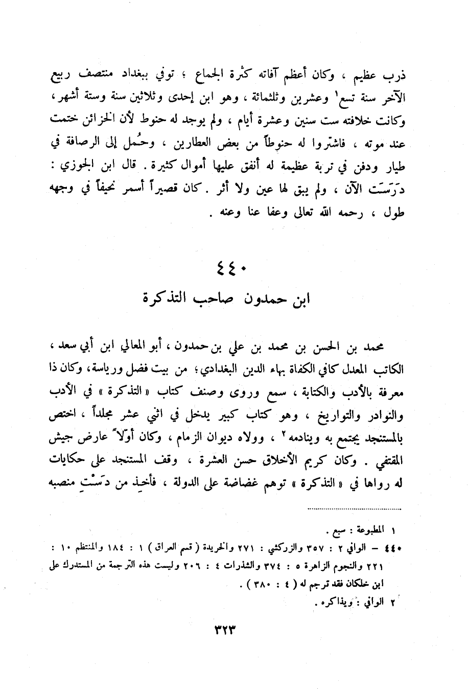 (2) الوافي 2: 357 والزركشي: 271 والخريدة (قسم العراق) 1: 184 والمنتظم 10: 221 والنجوم الزاهرة 5: 374 والشذرات 4: 206 وليست هذه الترجمة من المستدرك على ابن خلكان فقد ترجم له (4: 380) .