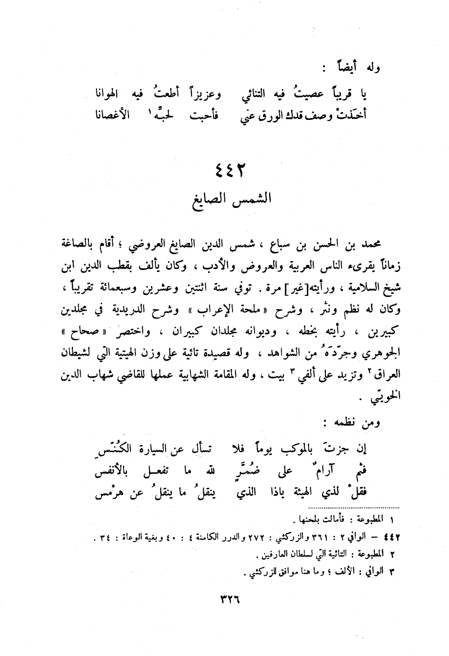 محمد بن الحسن بن سباع، شمس الدين الصايغ العروضي؛ أقام بالصاغة زماناً يقرئ الناس العربية والعروض والأدب، وكان يألف بقطب الدين ابن شيخ السلامية، ورأيته " غير " مرة. توفي سنة اثنتين وعشرين وسبعمائة تقريباً، وكان له نظم ونثر، وشرح " ملحة الإعراب " وشرح الدريدية في مجلدين كبيرين، رأيته بخطه، وديوانه مجلدين كبيرين، واختصر " صحاح " الجوهري وجرده من الشواهد، وله قصيدة تائية على وزن الهيتية التي لشيطان العراق (3) وتزيد على ألفي (4) بيت، وله المقامة الشهابية عملها للقاضي شهاب الدين الخويي.