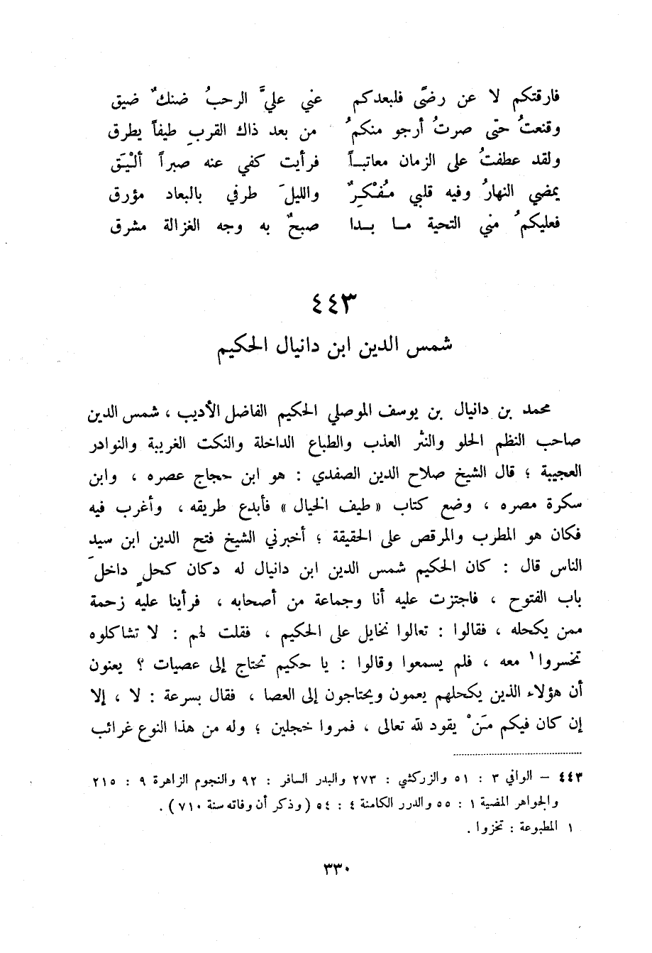 محمد بن دانيال بن يوسف الموصلي الحكيم الفاضل الأديب، شمس الدين صاحب النظم الحلو والنثر العذب والطباع الداخلة والنكت الغريبة والنوادر العجيبة؛ قال الشيخ صلاح الدين الصفدي: هو ابن حجاج عصره، وابن سكرة مصره، وضع كتاب " طيف الخيال " فأبدع طريقه، وأغرب فيه فكان هو المطرب والمرقص على الحقيقة؛ أخبرني الشيخ فتح الدين ابن سيد الناس قال: كان الحكيم شمس الدين ابن دانيال له دكان كحل داخل باب الفتوح، فاجتزت عليه أنا وجماعة من أصحابه، فرأينا عليه زحمة ممن يكحله، فقالوا: تعالوا نخايل على الحكيم، فقلت لهم: لا تشاكلوه تخسروا (2) معه، فلم يسمعوا وقالوا: يا حكيم تحتاج إلى عصيات؟ يعنون أن هؤلاء الذين يكحلهم يعمون ويحتاجون إلى العصا، فقال بسرعة: لا، إلا إن كان فيكم من يقود لله تعالى، فمروا خجلين؛ وله من هذا النوع غرائب