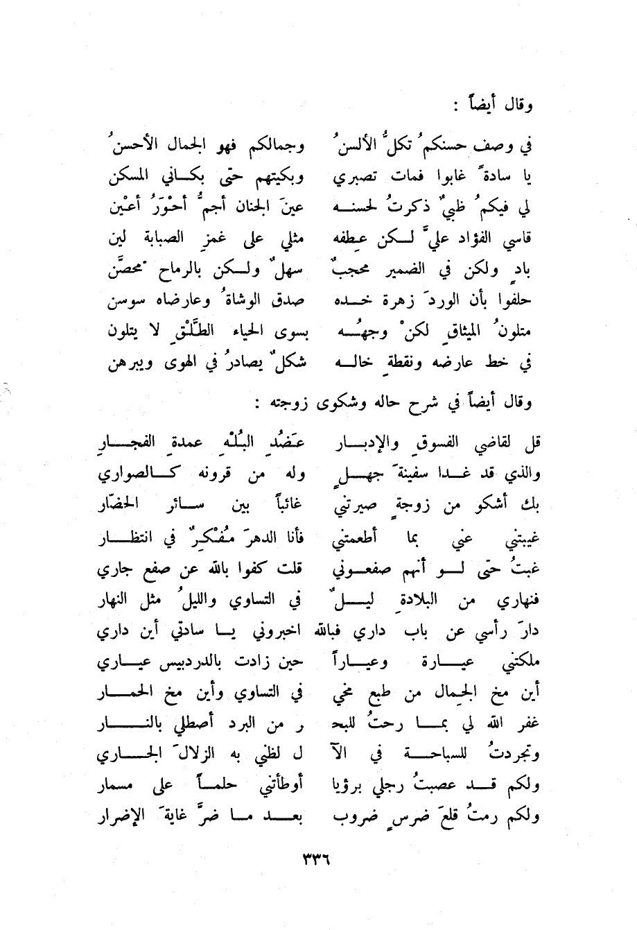 في خط عارضه ونقطة خاله ... شكل يصادر في الهوى ويبرهن وقال أيضاً في شرح حاله وشكوى زوجته: