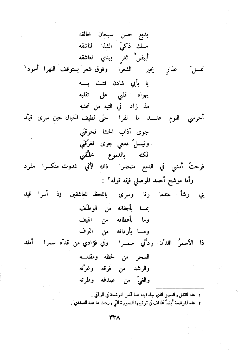 فرحت أمشي في الدمع منحدرا ... ذاك لأني غدوت منكسرا مفرد وأما موشح أحمد الموصلي فإنه قوله (2) :