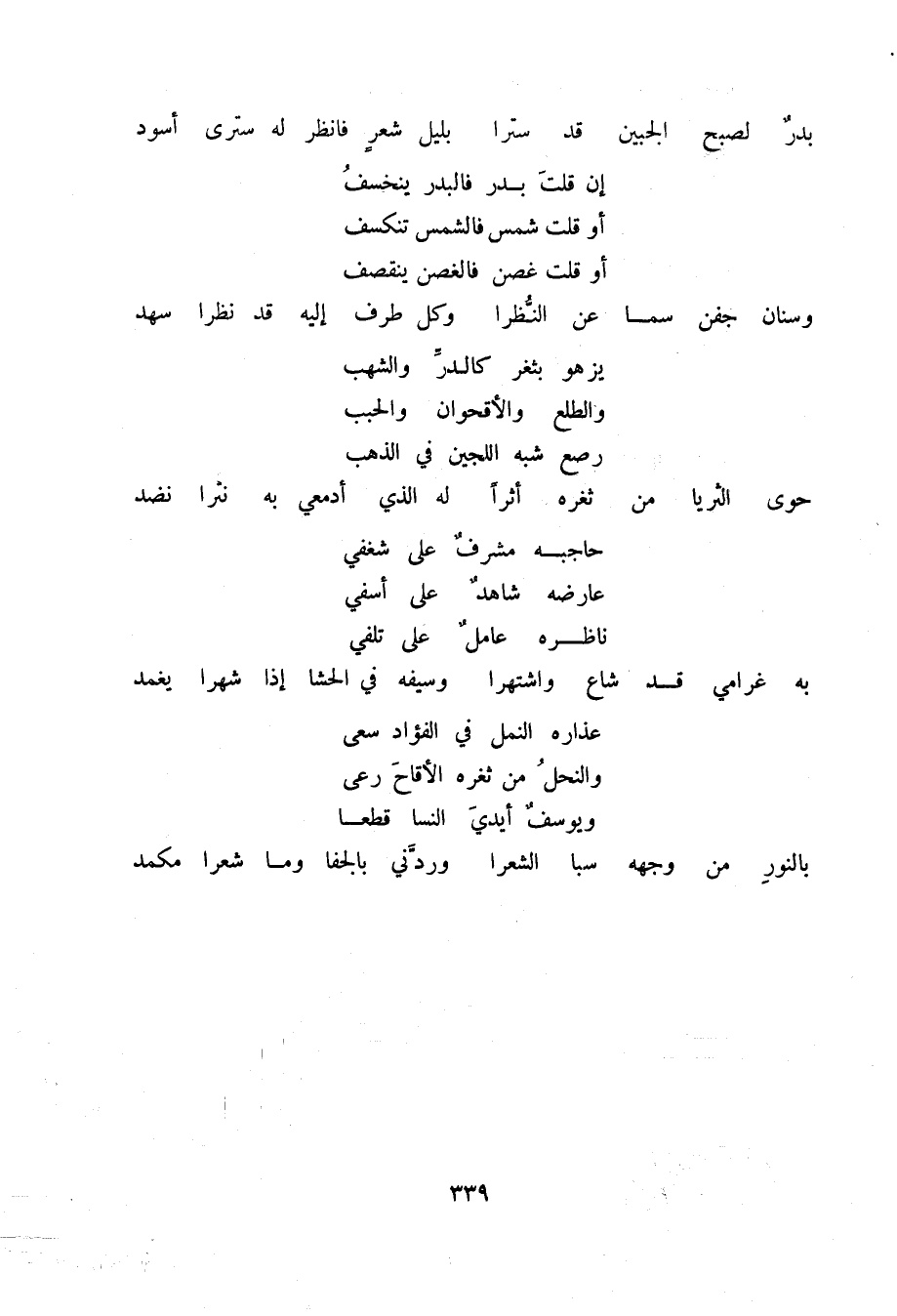 بدر لصبح الجبين قد سترا ... بليل شعر فانظر له سترى أسود إن قلت بدراً فالبدر ينخسف ... أو قلت شمس فالشمس تنكسف ... أو قلت غصن فالغصن ينقصف ...