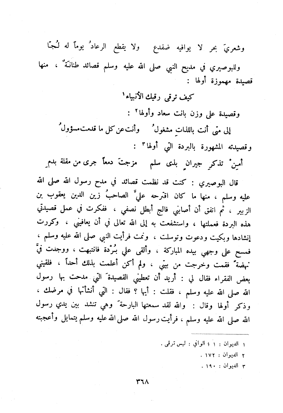 وشعري بحر لا يوافيه ضفدع ... ولا يقطع الرعاد يوماً له لجا وللبوصيري في مديح النبي صلى الله عليه وسلم قصائد طنانة، منها قصيدة مهموزة أولها: