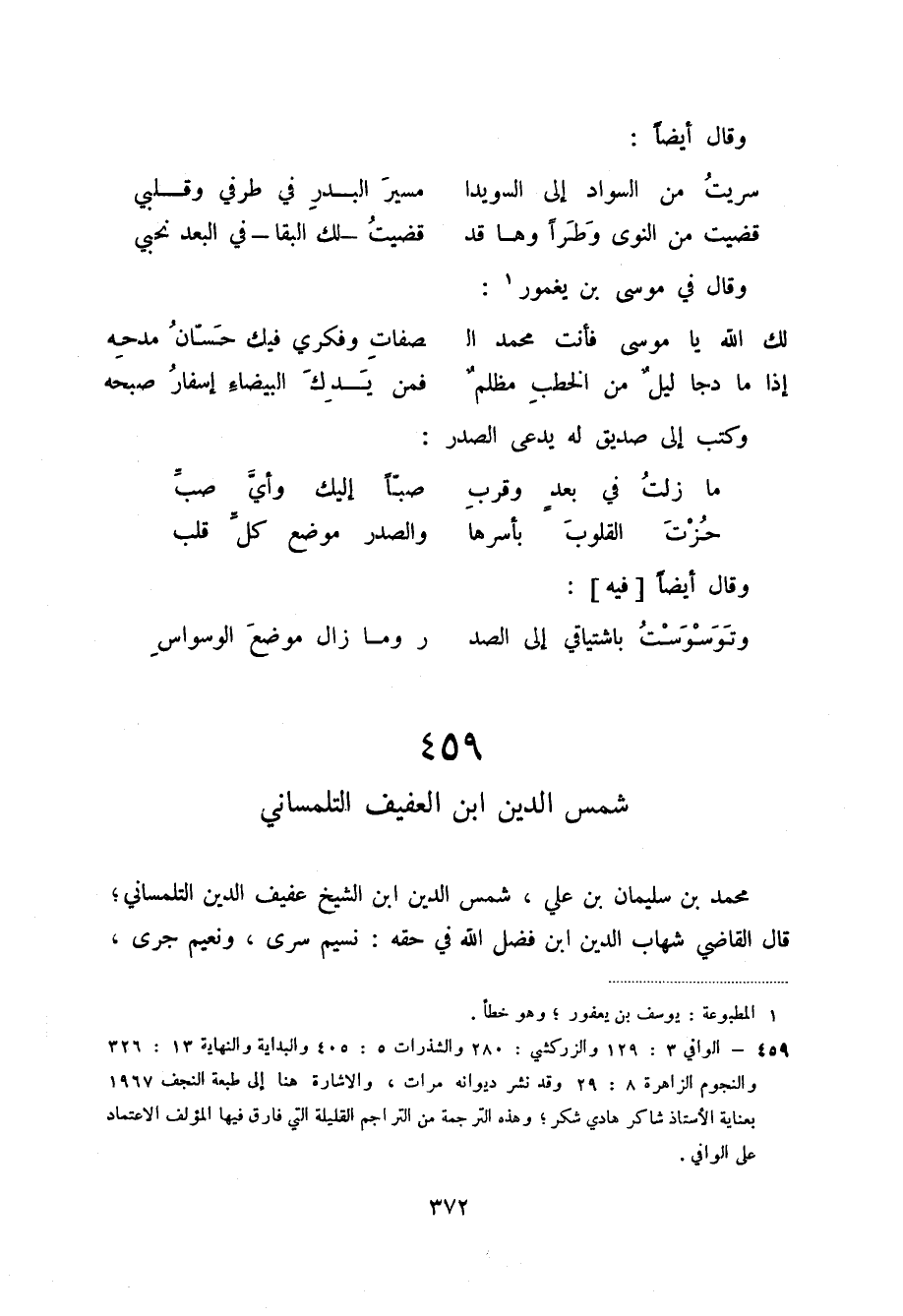 (2) الوافي 3: 129 والزركشي: 280 والشذرات 5: 405 والبداية والنهاية 13: 326 والنجوم الزاهرة 8: 29 وقد نشر ديوانه مرات، والاشارة هنا إلى طبعة النجف 1967 بعناية الأستاذ شاكر هادي شكر؛ وهذه الترجمة من التراجم القليلة التي فارق فيها المؤلف الاعتماد على الوافي.