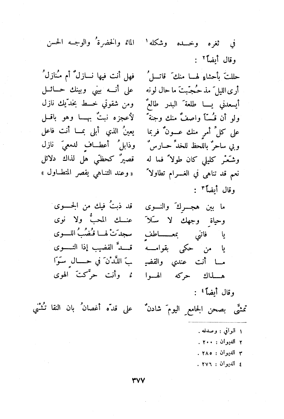 في ثغره وخده وشكله (1) ... الماء والخضرة والوجه الحسن وقال أيضاً (2) :