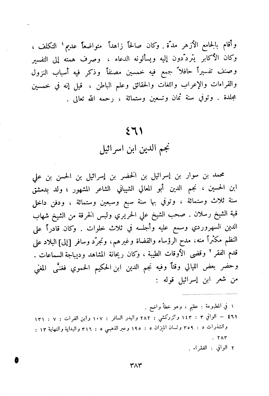 محمد بن سوار بن إسرائيل بن الخضر بن إسرائيل بن الحسن بن علي ابن الحسين، نجم الدين أبو المعالي الشيباني الشاعر المشهور؛ ولد بدمشق سنة ثلاث وستمائة، وتوفي بها سنة سبع وسبعين وستمائة، ودفن داخل قبة الشيخ رسلان. صحب الشيخ علي الحريري ولبس الخرقة من الشيخ شهاب الدين السهروردي وسمع عليه وأجلسه في ثلاث خلوات. وكان قادراً على النظم مكثراً منه، مدح الرؤساء والقضاة وغيرهم، وتجرد وسافر " إلى " البلاد على قدم الفقر (3) وقضى الأوقات الطيبة، وكان ريحانة المشاهد وديباجة السماعات. وحضر بعض الليالي وقتاً وفيه نجم الدين ابن الحكيم الحموي فغنى المغني من شعر ابن إسرائيل قوله: