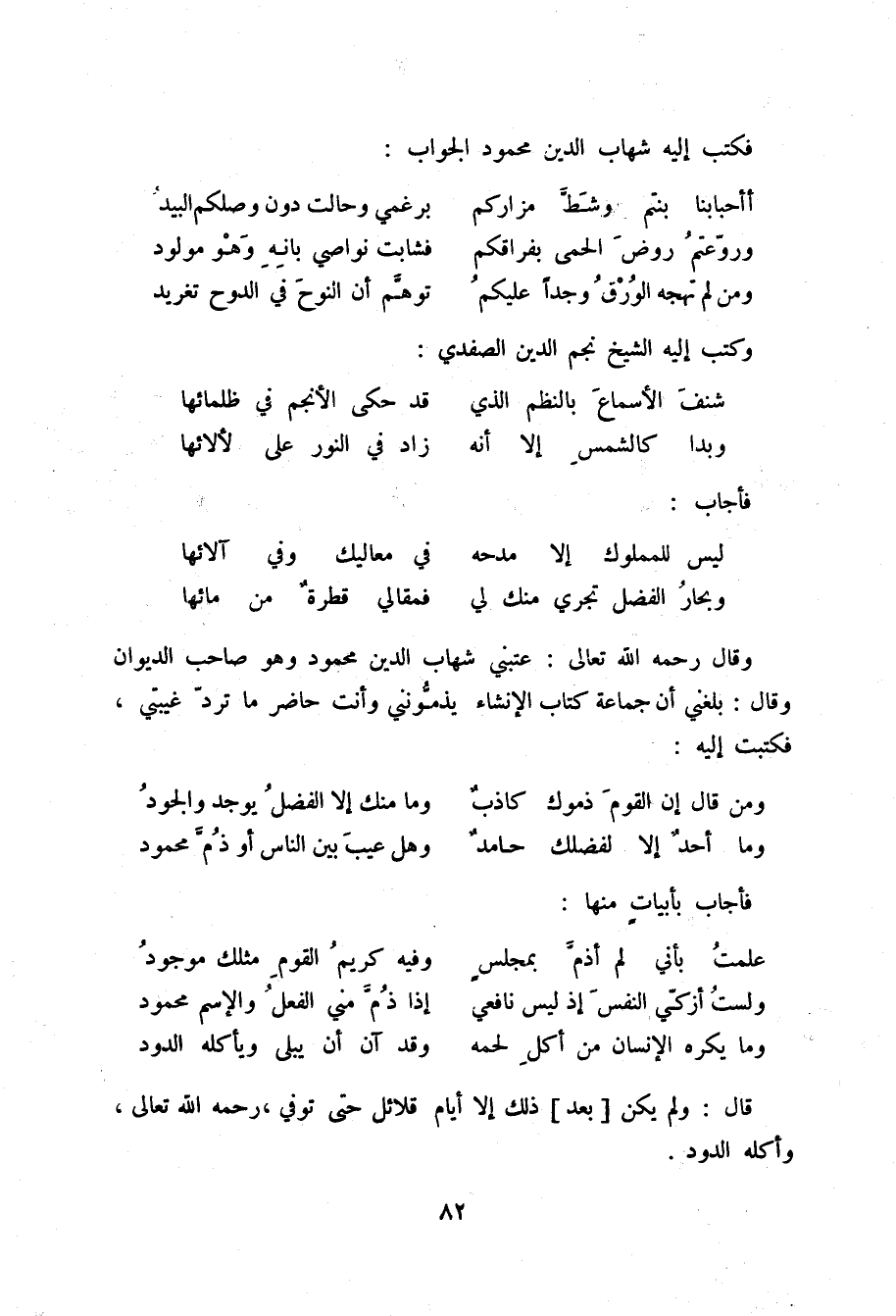 وبحار الفضل تجري منك لي ... فمقالي قطرة من مائها وقال رحمه الله تعالى: عتبني شهاب الدين محمود وهو صاحب الديوان وقال: بلغني أن جماعة كتاب الإنشاء يذمونني وأنت حاضر ما ترد غيبتي، فكتبت إليه: