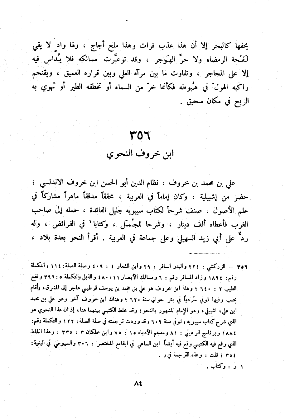 (1) الزركشي: 224 والبدر السافر: 29 وابن العشار 4: 409 وصلة الصلة: 114 والتكلمة رقم: 1894 وزاد المسافر رقم: 6 وممالك الأبصار 11: 480 والذيل والتكلمة 5: 396 ونفح الطيب 2: 640؛ وهذا ابن خروف هو علي بن محمد بن يوسف قرطبي هاجر إلى المشرق، وأقام بحلب وفيها توفي متردياً في بئر حوالي سنة 620؛ وهناك ابن خروف آخر وهو علي بن محمد ابن علي، اشبيلي، وهو الإمام المشهور بالنحو؛ وقد خلط الكتبي بينهما هنا، إذ أن هذا النحوي الذي شرح كتاب سيبويه وتوفي سنة 609 وقد وردت ترجمته في صلة الصلة: 122 والتكلمة رقم: 1884 وبرنامج الرعيني: 81 ومعجم الأدباء 15: 75 وابن خلكان 3: 335: وهذا الخلط الذي وقع فيخ الكتبي وقع فيه أيضاً ابن الساعي في الجامع المختصر: 306 والسيوطي في البغية: 354؛ قلت: وهذه الترجمة في ر.