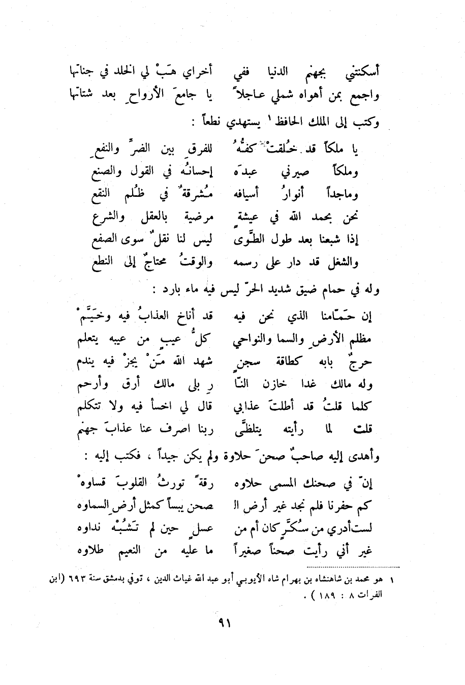 (1) هو محمد بن شاهنشاه بن بهرام شاه الأيوبي أبو عبد الله غياث الدين، توفي بدمشق سنة 693 (ابن الفرات 8: 189) .