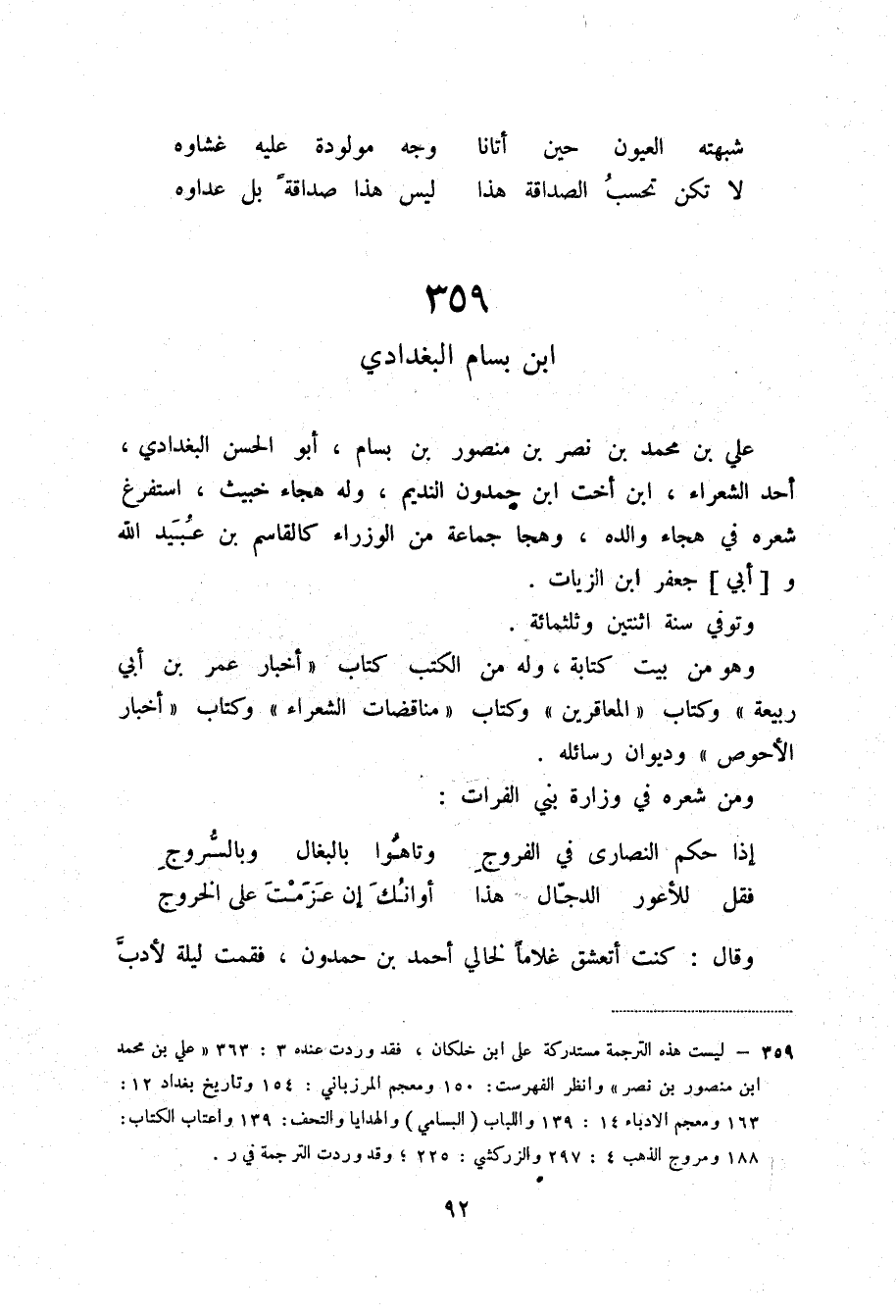 (1) ليست هذه الترجمة مستدركة على ابن خلكان، فقد وردت عنده 3: 363 ((علي بن محمد ابن منصور بن نصر)) وانظر الفهرست: 150 ومعجم المرزباني: 154 وتاريخ بغداد 12: 163 ومعجم الأدباء 14: 139 واللباب (البسامي) والهدايا والتحف: 139 واعتاب الكتاب: 188 ومروج الذهب 4: 297 والزركشي: 225؛ وقد وردت الترجمة في ر.