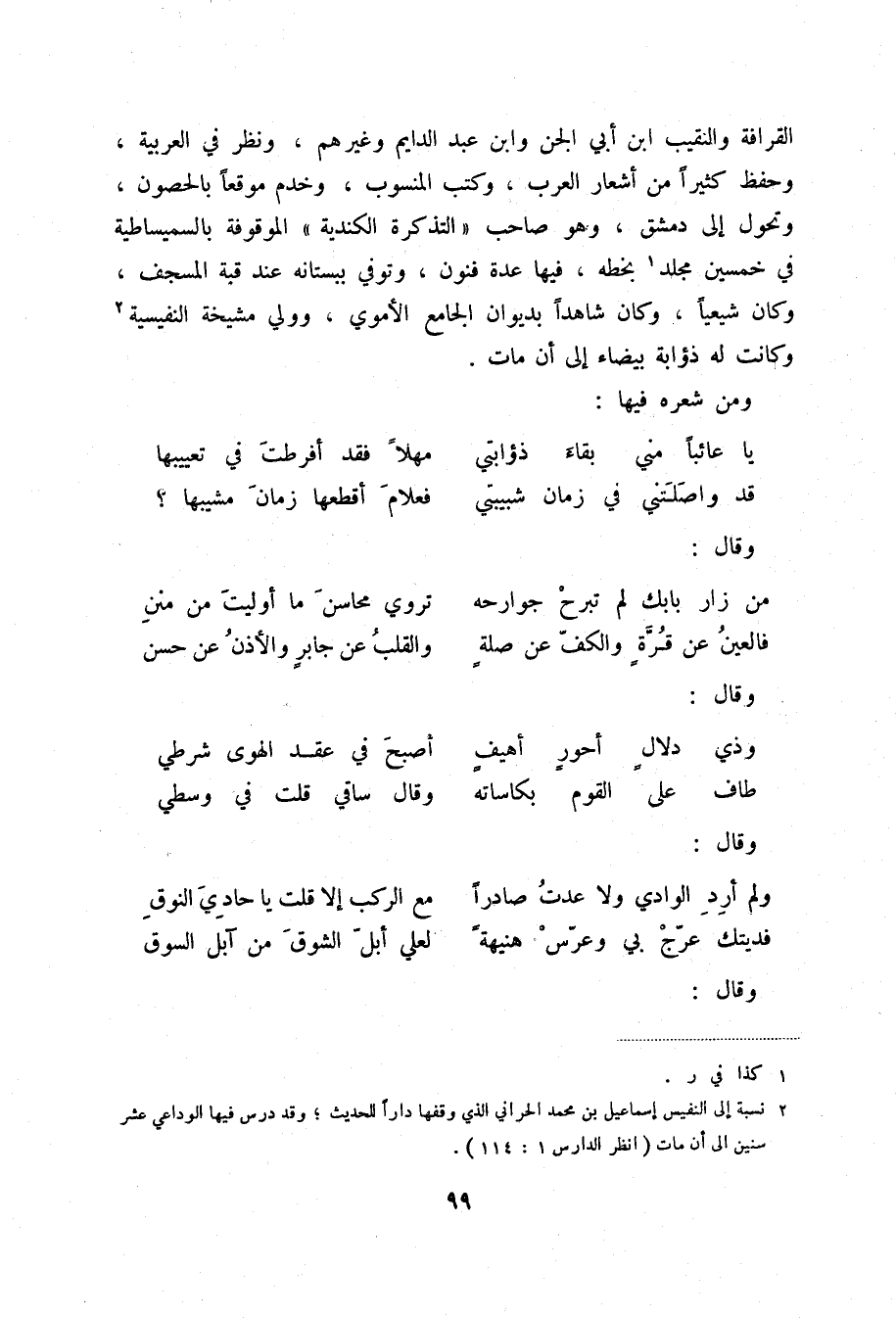 القرافة والنقيب ابن أبي الجن وابن عبد الدايم وغيرهم، ونظر في العربية، وحفظ كثيراً من أشعار العرب، وكتب المنسوب، وخدم موقعاً بالحصون، وتحول إلى دمشق، وهو صاحب " التذكرة الكندية " الموقوفة بالسميساطية في خمسين مجلد (1) بخطه، فيها عدة فنون، وتوفي ببستانه عند قبة المسجف، وكان شيعياً، وكان شاهداً بديوان الجامع الأموي، وولي مشيخة النفيسية (2) وكانت له ذؤابة بيضاء إلى أن مات.