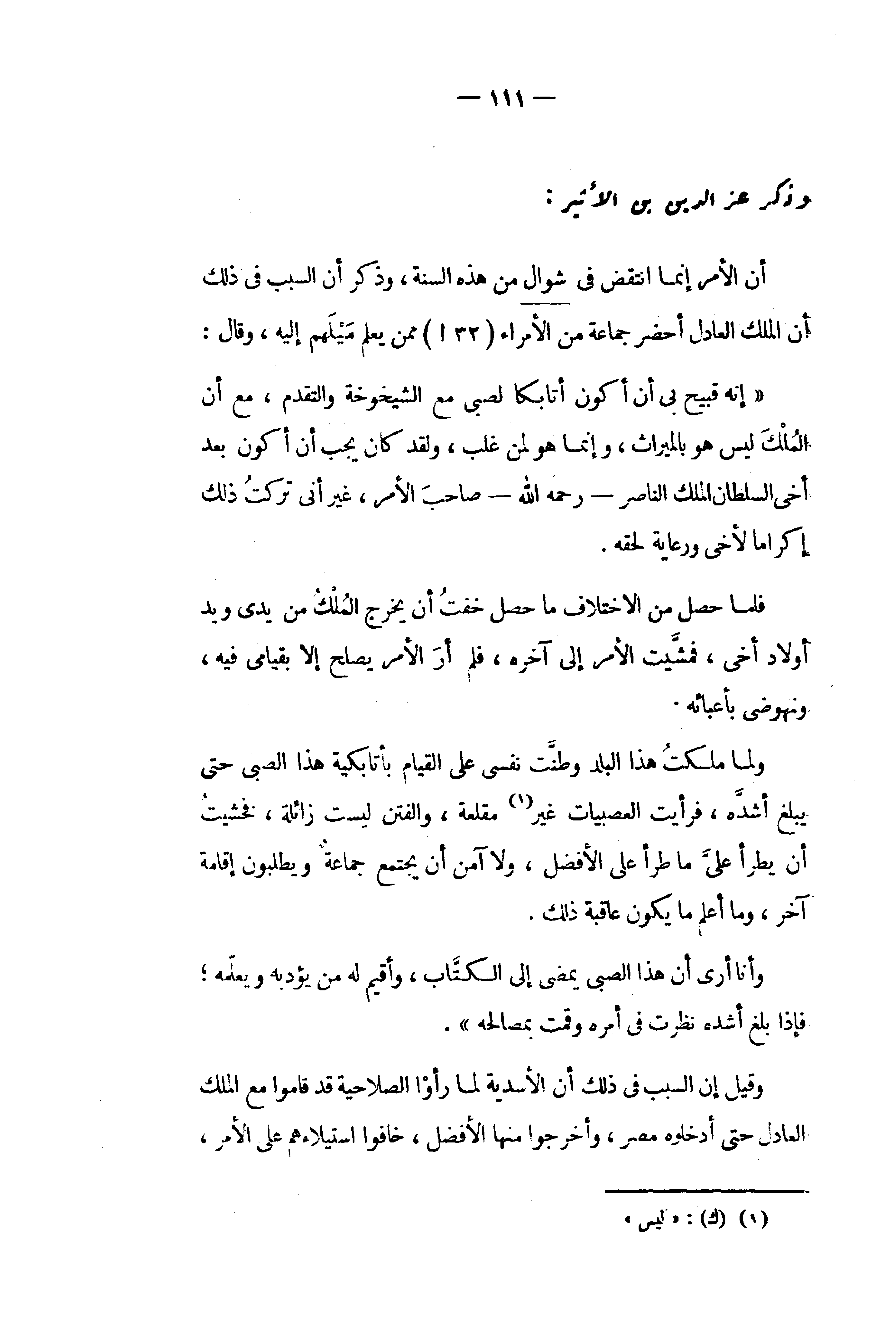 «إنه قبيح بى أن أكون أتابكا لصبى مع الشيخوخة والتقدم، مع أن الملك ليس هو بالميراث، وإنما هو لمن غلب، ولقد كان يجب أن أكون بعد أخى السلطان الملك الناصر - رحمه الله - صاحب الأمر، غير أنى تركت ذلك إكراما لأخى ورعاية لحقه.