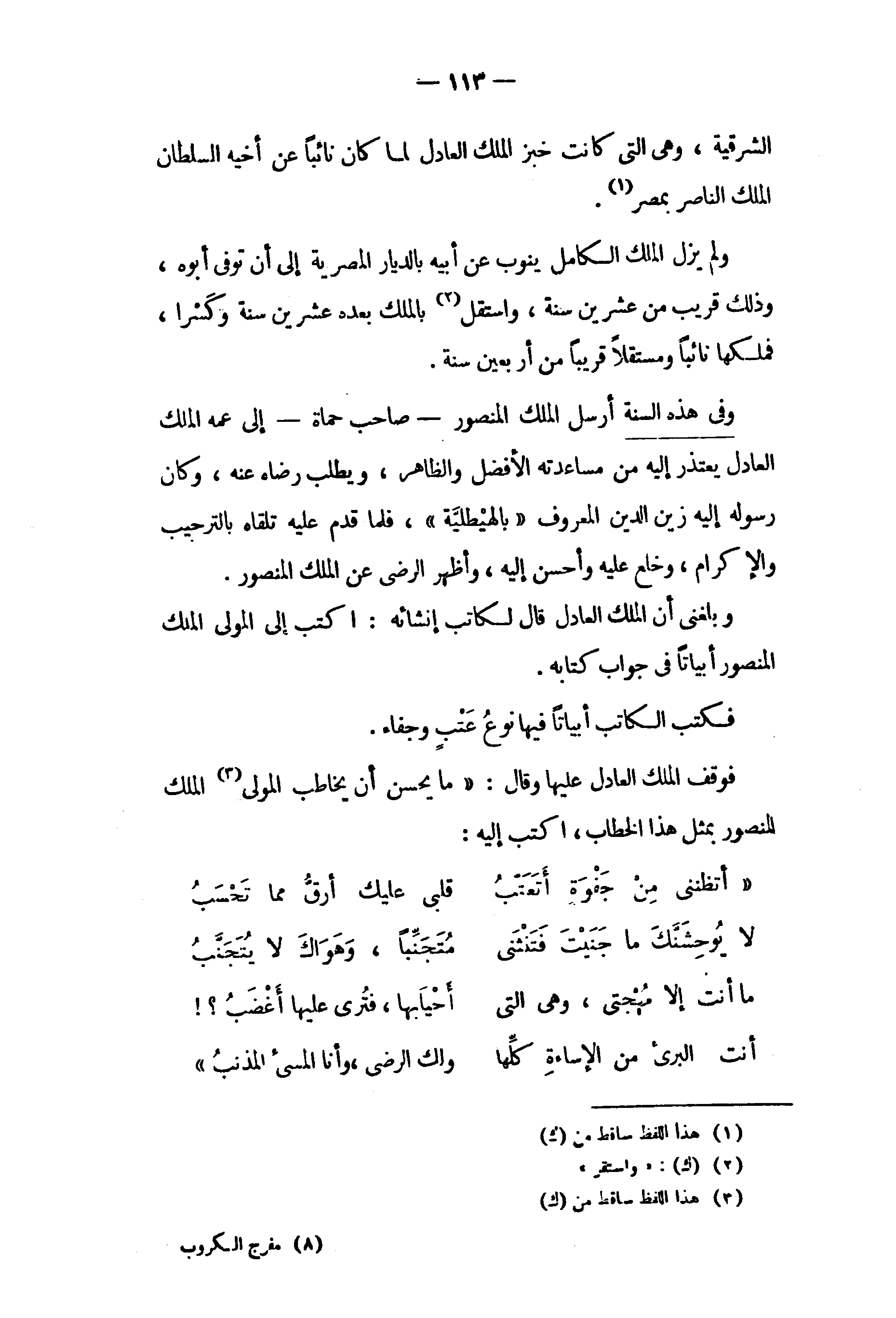 وبلغنى أن الملك العادل قال لكاتب إنشائه: اكتب إلى المولى الملك المنصور أبياتا في جواب كتابه.