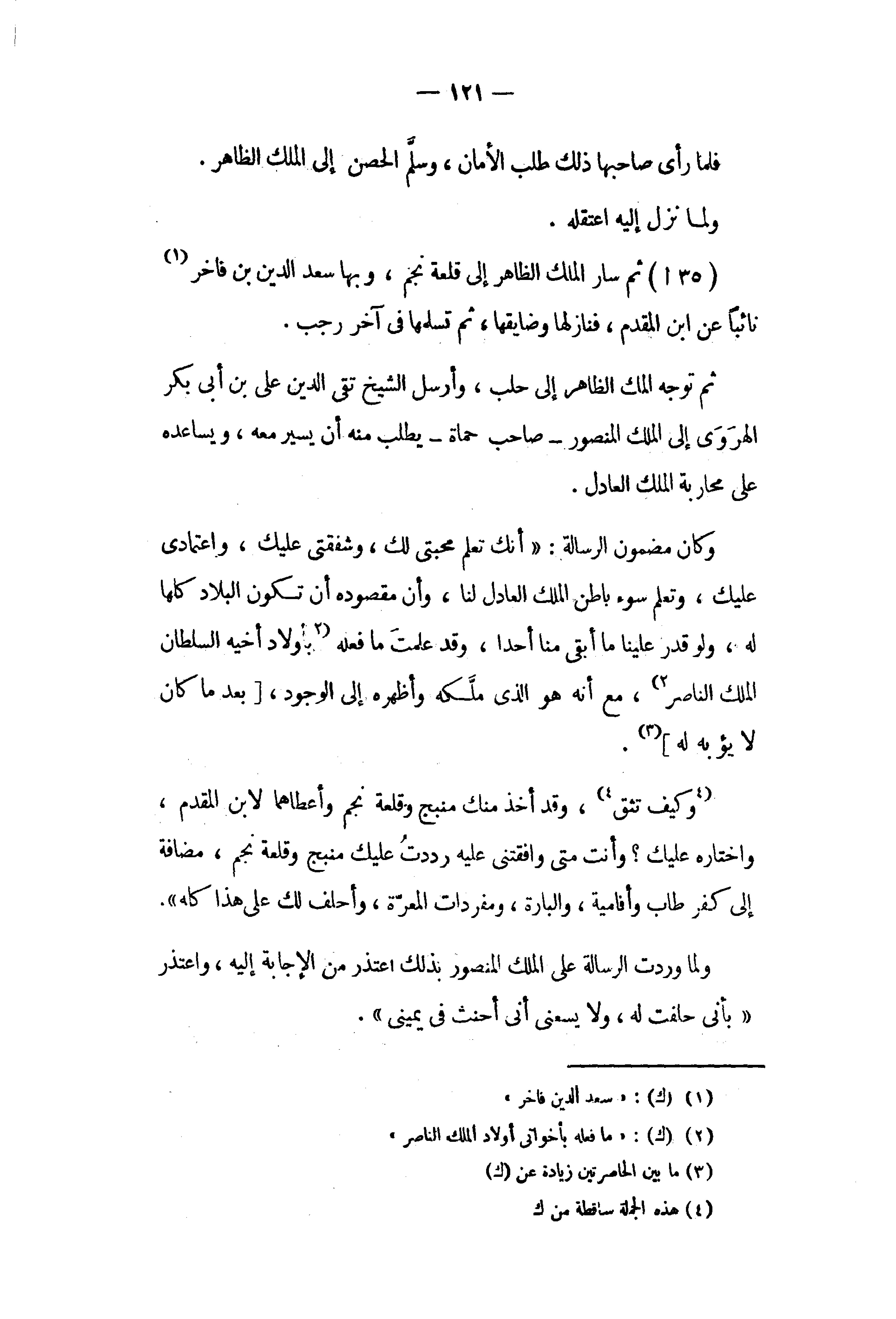 (35 ا) ثم سار الملك الظاهر إلى قلعة نجم، وبها سعد الدين بن فاخر (¬1) نائبا عن ابن المقدم، فنازلها وضايقها، ثم تسلمها في آخر رجب.