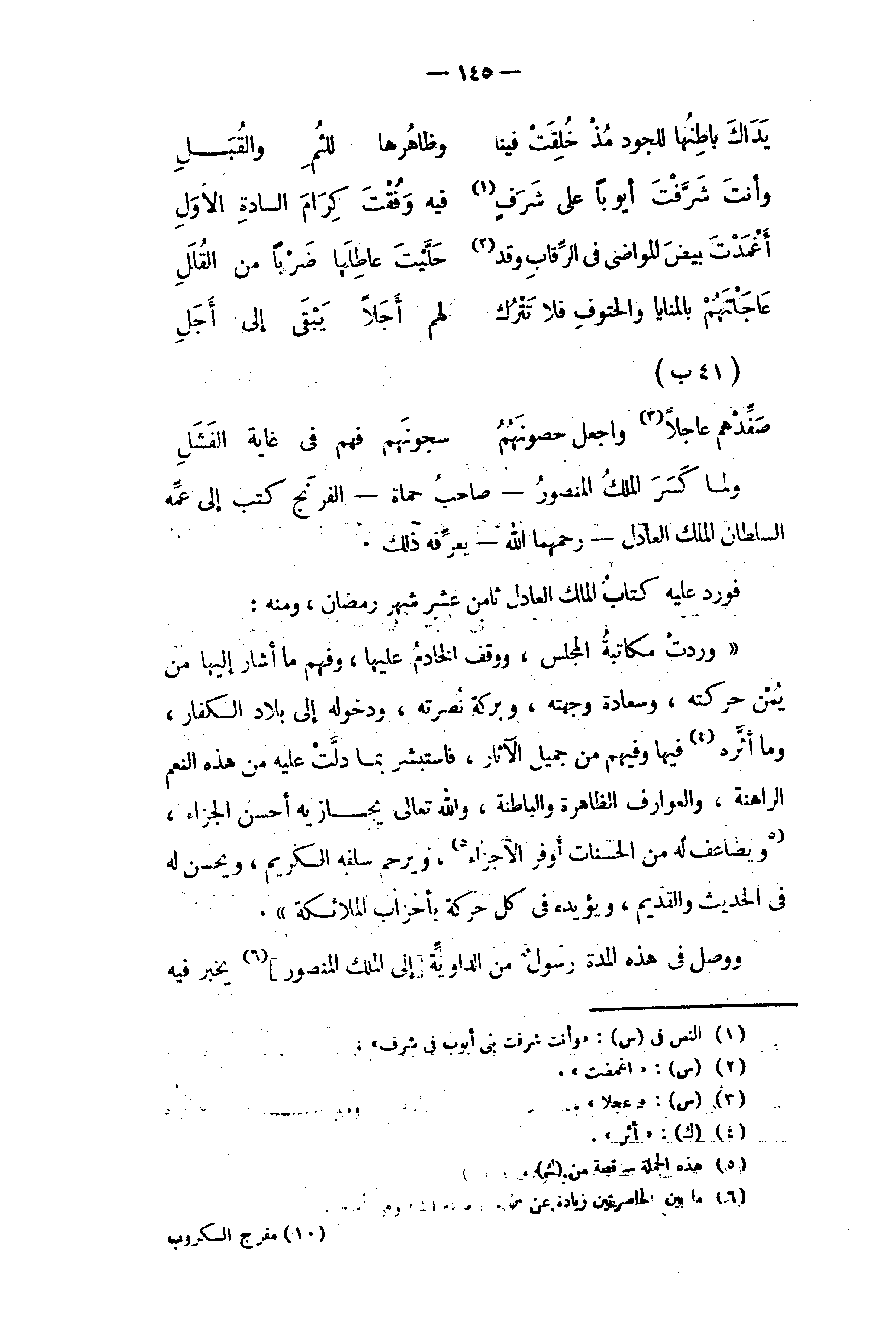 الراهنة، والعوارف الظاهرة والباطنة، والله تعالى يجازيه أحسن الجزاء، (5) ويضاعف له من الحسنات أوفر الأجزاء (¬5)، ويرحم سلفه الكريم، ويحسن له في الحديث والقديم، ويؤيده في كل حركة بأحزاب الملائكة».