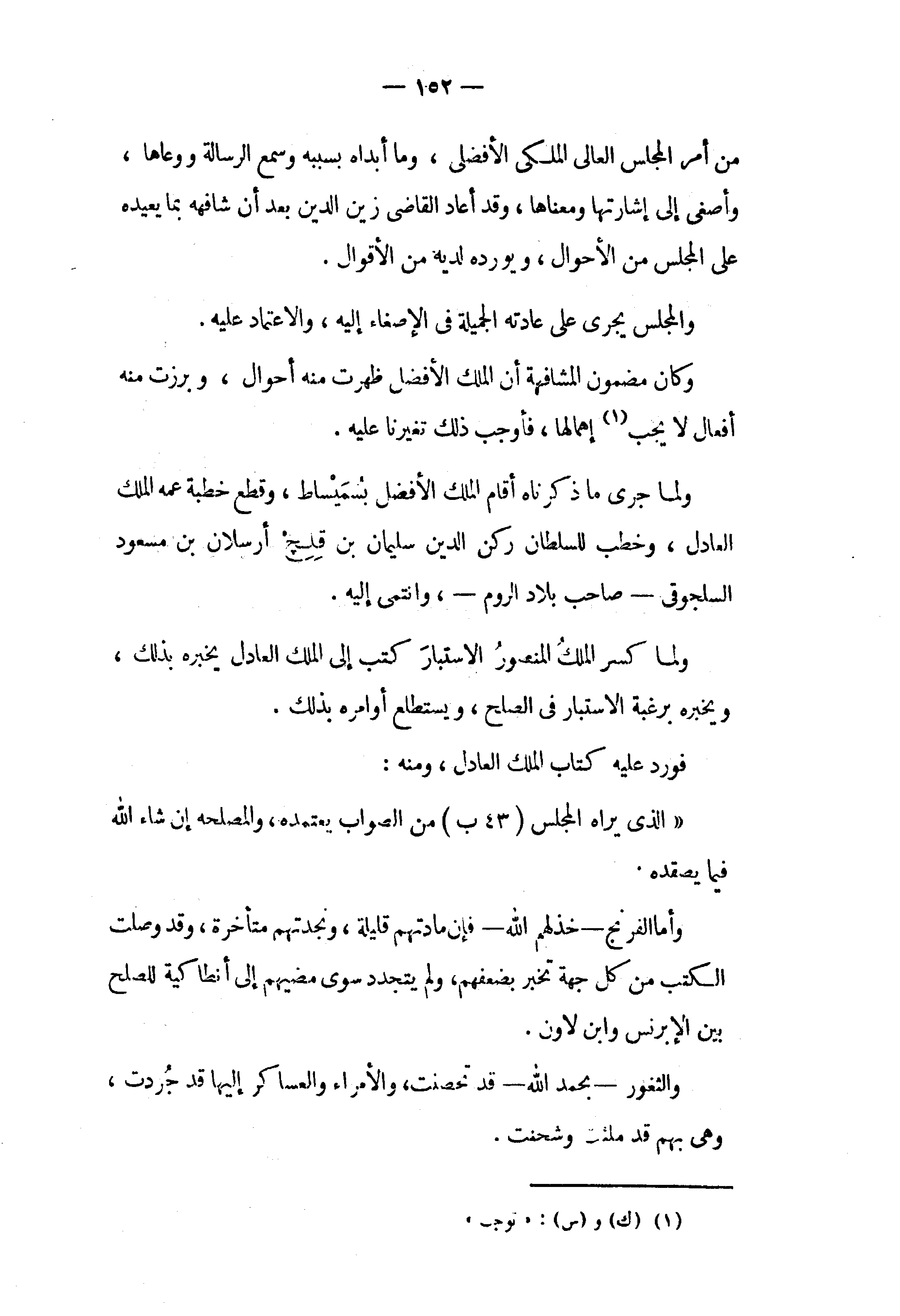 من أمر المجلس العالى الملكى الأفضلى، وما أبداه بسببه وسمع الرسالة ووعاها، وأصغى إلى إشارتها ومعناها، وقد أعاد القاضى زين الدين بعد أن شافهه بما يعيده على المجلس من الأحوال، ويورده لديه من الأقوال.