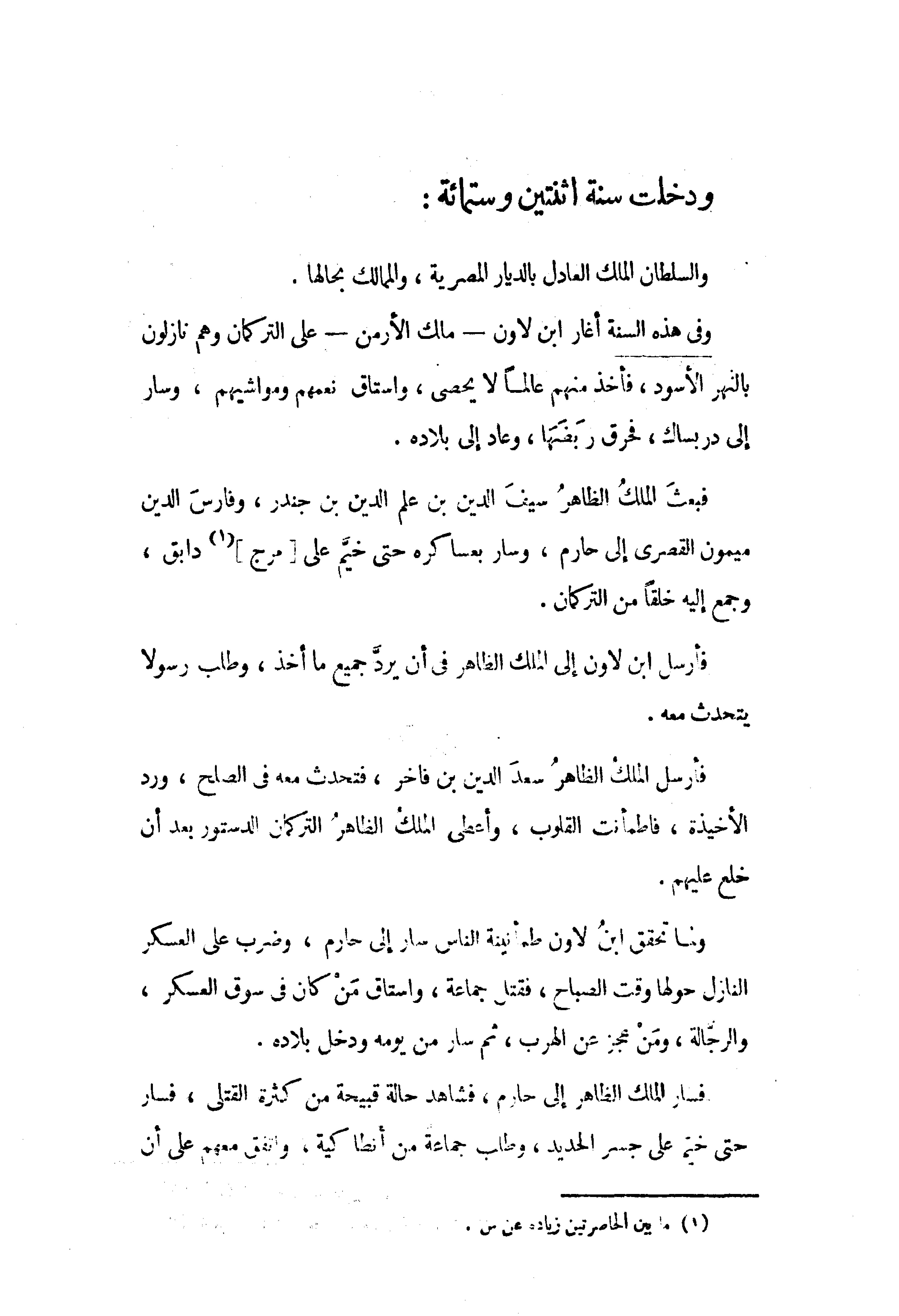 فبعث الملك الظاهر سيف الدين بن علم الدين بن جندر، وفارس الدين ميمون القصرى إلى حارم، وسار بعساكره حتى خيّم على [مرج] (¬1) دابق، وجمع إليه خلقا من التركمان.