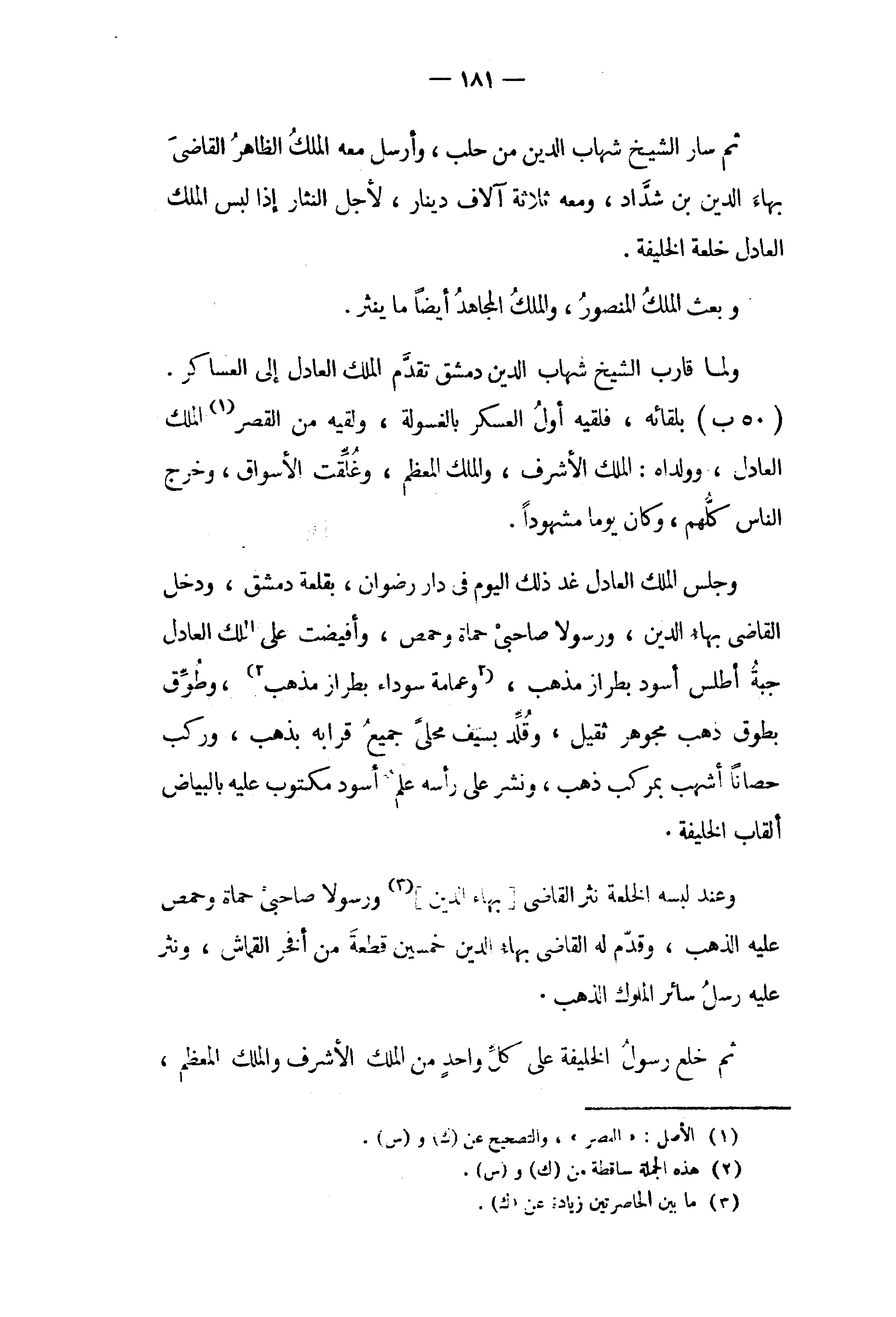 وجلس الملك العادل غد ذلك اليوم في دار رضوان، بقلعة دمشق، ودخل القاضى بهاء الدين، ورسولا صاحبى حماة وحمص، وأفيضت على الملك العادل جبة أطلس أسود بطراز مذهب، (2) وعمامة سوداء بطراز مذهب (¬2)، وطوّق بطوق ذهب مجوهر ثقيل، وقلّد بسيف محلى جميع قرابه بذهب، وركب حصانا أشهب بمركب ذهب، ونشر على رأسه علم أسود مكتوب عليه بالبياض ألقاب الخليفة.
