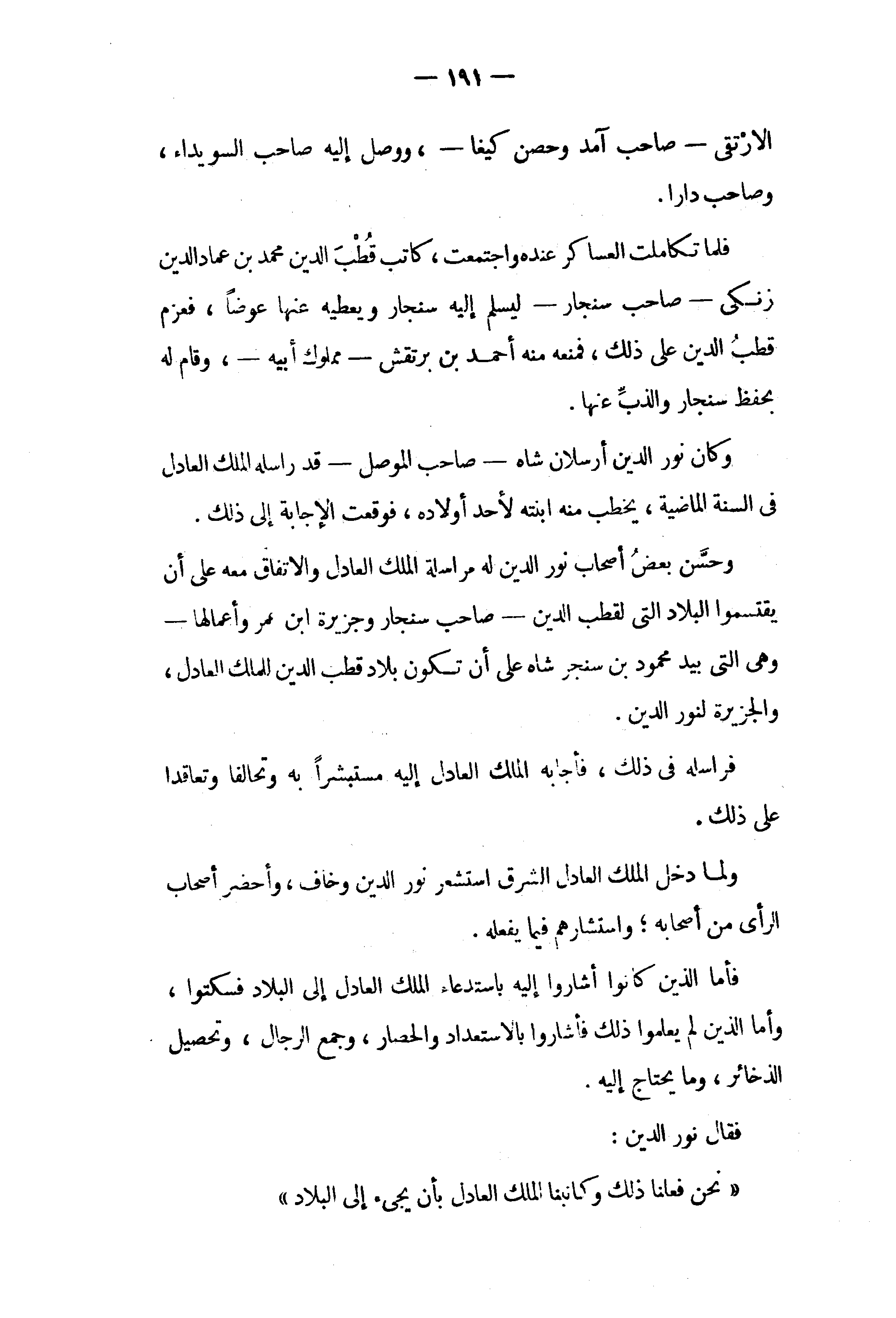 وحسّن بعض أصحاب نور الدين له مراسلة الملك العادل والاتفاق معه على أن يقتسموا البلاد التي لقطب الدين - صاحب سنجار وجزيرة ابن عمر وأعمالها - وهى التي بيد محمود بن سنجر شاه على أن تكون بلاد قطب الدين للملك العادل، والجزيرة لنور الدين.