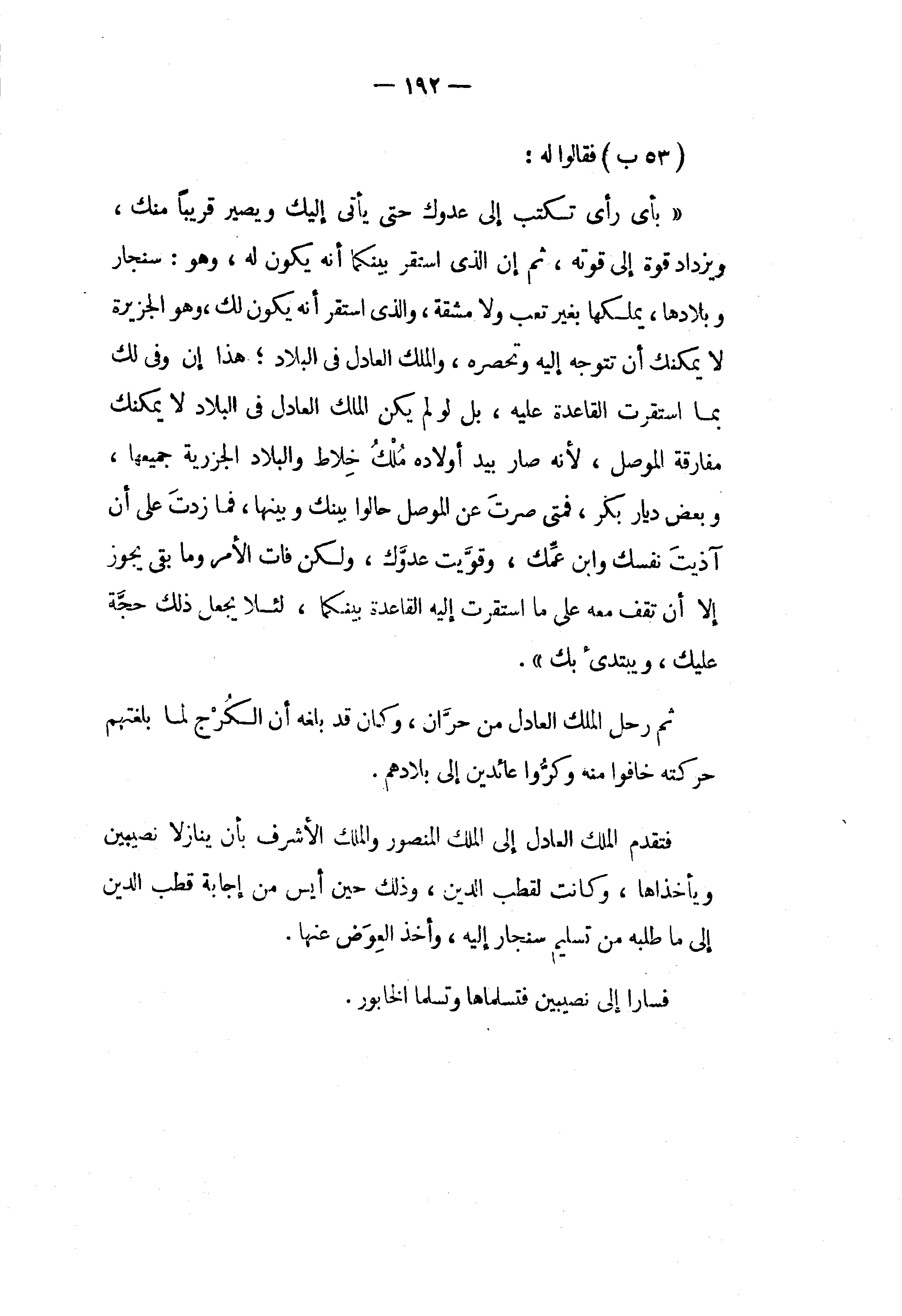 «بأى رأى تكتب إلى عدوك حتى يأتى إليك ويصير قريبا منك، ويزداد قوة إلى قوته، ثم إن الذى استقر بينكما أنه يكون له، وهو: سنجار وبلادها، يملكها بغير تعب ولا مشقة، والذى استقر أنه يكون لك، وهو الجزيرة لا يمكنك أن تتوجه إليه وتحصره، والملك العادل في البلاد؛ هذا إن وفى لك بما استقرت القاعدة عليه، بل لو لم يكن الملك العادل في البلاد لا يمكنك مفارقة الموصل، لأنه صار بيد أولاده ملك خلاط والبلاد الجزرية جميعها، وبعض ديار بكر، فمتى صرت عن الموصل حالوا بينك وبينها، فما زدت على أن آذيت نفسك وابن عمّك، وقوّيت عدوّك، ولكن فات الأمر وما بقى يجوز إلا أن تقف معه على ما استقرت إليه القاعدة بينكما، لئلا يجعل ذلك حجّة عليك، ويبتدئ بك».