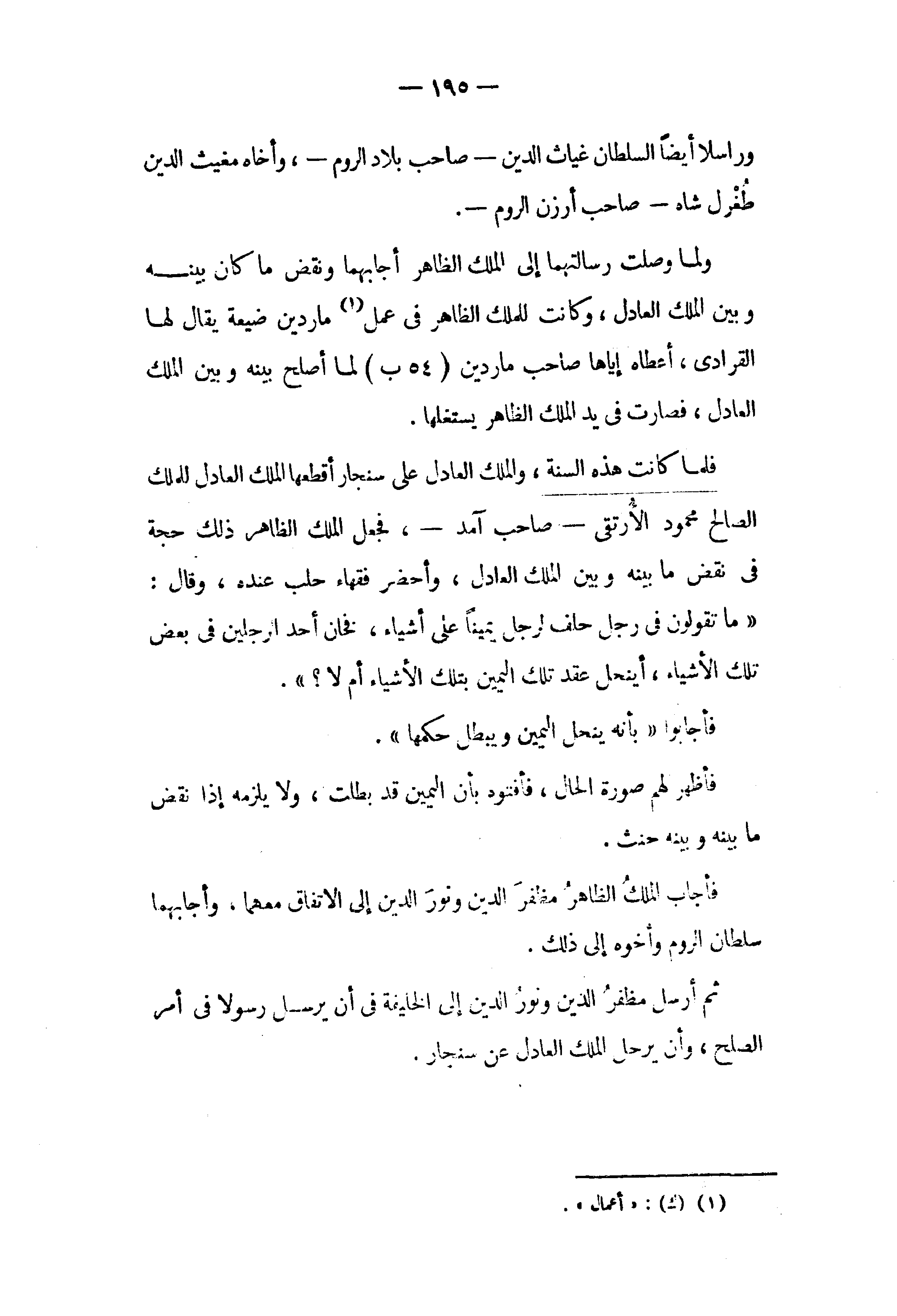 ولما وصلت رسالتهما إلى الملك الظاهر أجابهما ونقض ما كان بينه وبين الملك العادل، وكانت الملك الظاهر في عمل (¬1) ماردين ضيعة يقال لها القرادى، أعطاه إياها صاحب ماردين (54 ب) لما أصلح بينه وبين الملك العادل، فصارت في يد الملك الظاهر يستغلها.