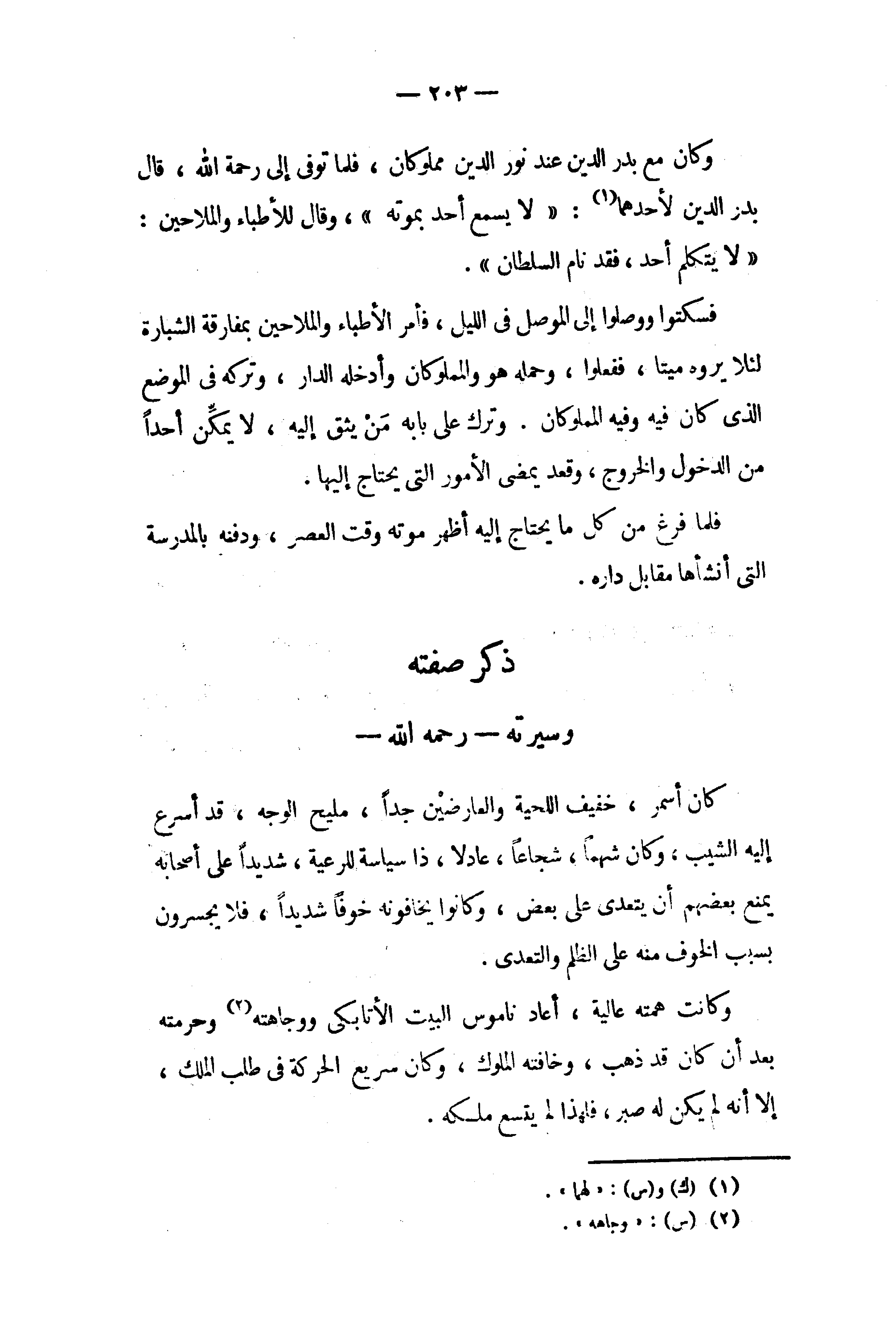 وكان مع بدر الدين عند نور الدين مملوكان، فلما توفى إلى رحمة الله، قال بدر الدين لأحدهما (¬1): «لا يسمع أحد بموته»، وقال للأطباء والملاحين: