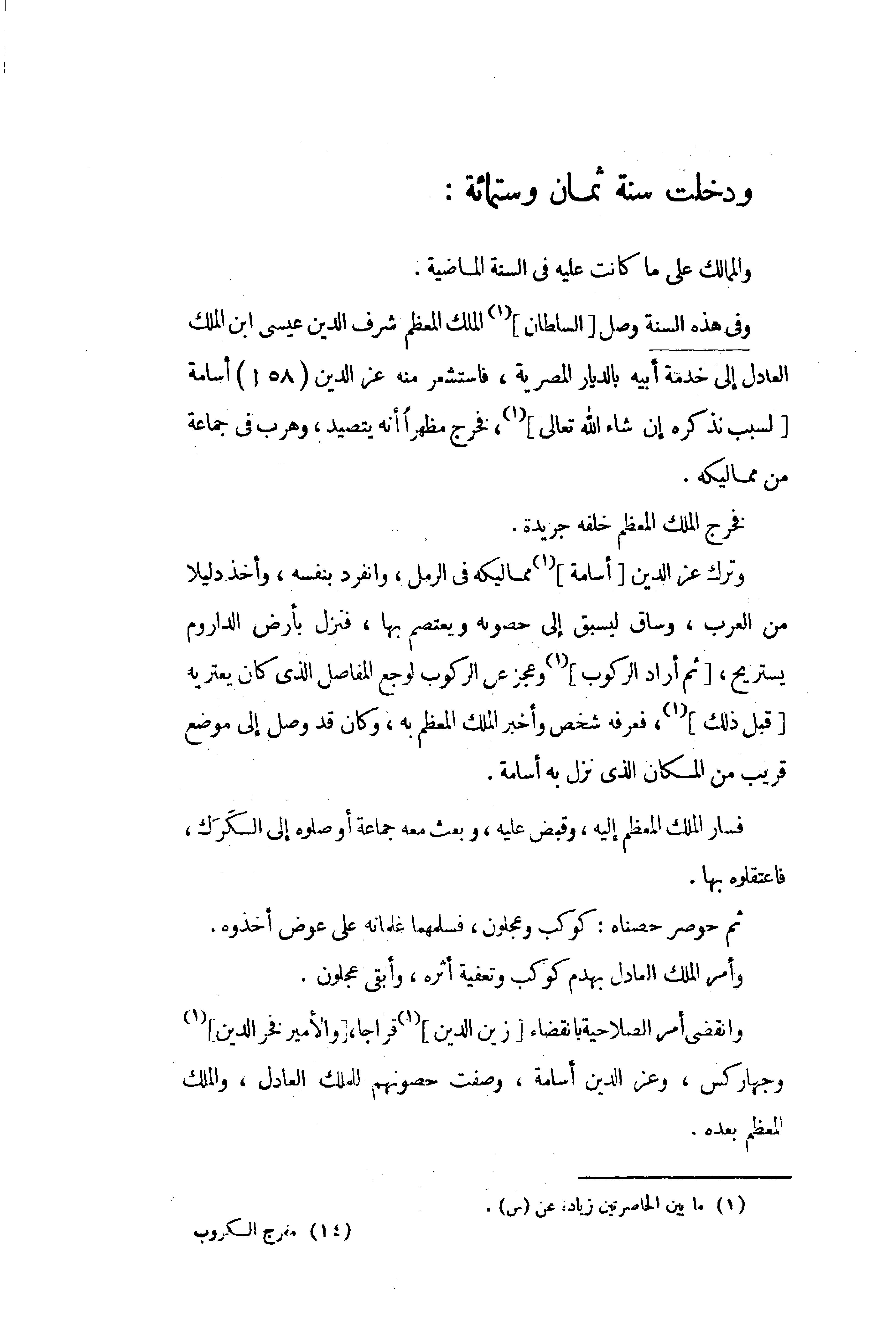 وفى هذه السنة وصل [السلطان] (1) الملك المعظم شرف الدين عيسى ابن الملك العادل إلى خدمة أبيه بالديار المصرية، فاستشعر منه عز الدين (58 ا) أسامة [لسبب نذكره إن شاء الله تعالى] (1)، فخرج مظهرا أنه يتصيد، وهرب في جماعة من مماليكه.