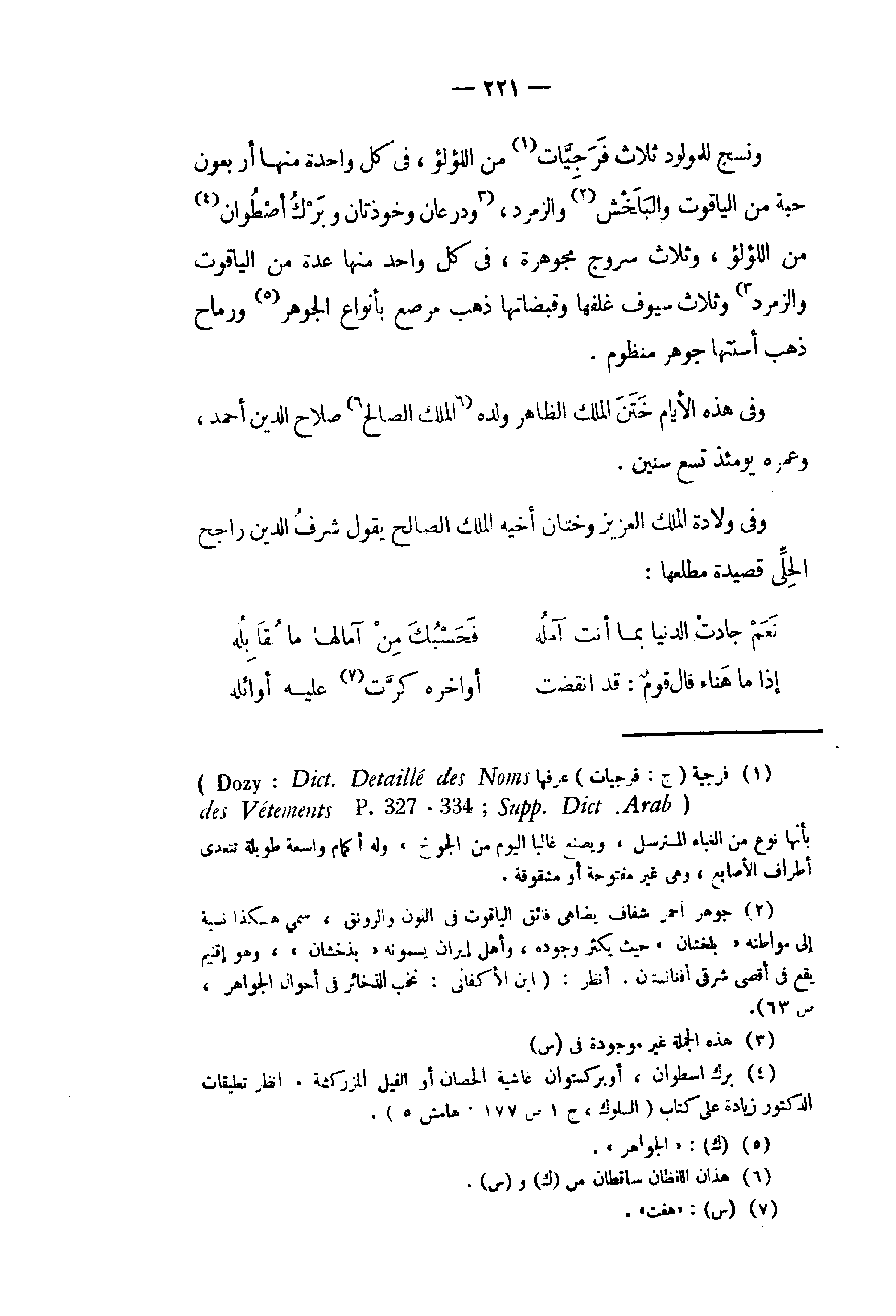 ونسج للمولود ثلاث فرجيّات (¬1) من اللؤلؤ، في كل واحدة منها أربعون حبة من الياقوت والبلخش (¬2) والزمرد، (¬3) ودرعان وخوذتان وبرك أصطوان (¬4) من اللؤلؤ، وثلاث سروج مجوهرة، في كل واحد منها عدة من الياقوت والزمرد (3) وثلاث سيوف غلفها وقبضاتها ذهب مرصع بأنواع الجوهر (¬5) ورماح ذهب أسنتها جوهر منظوم.