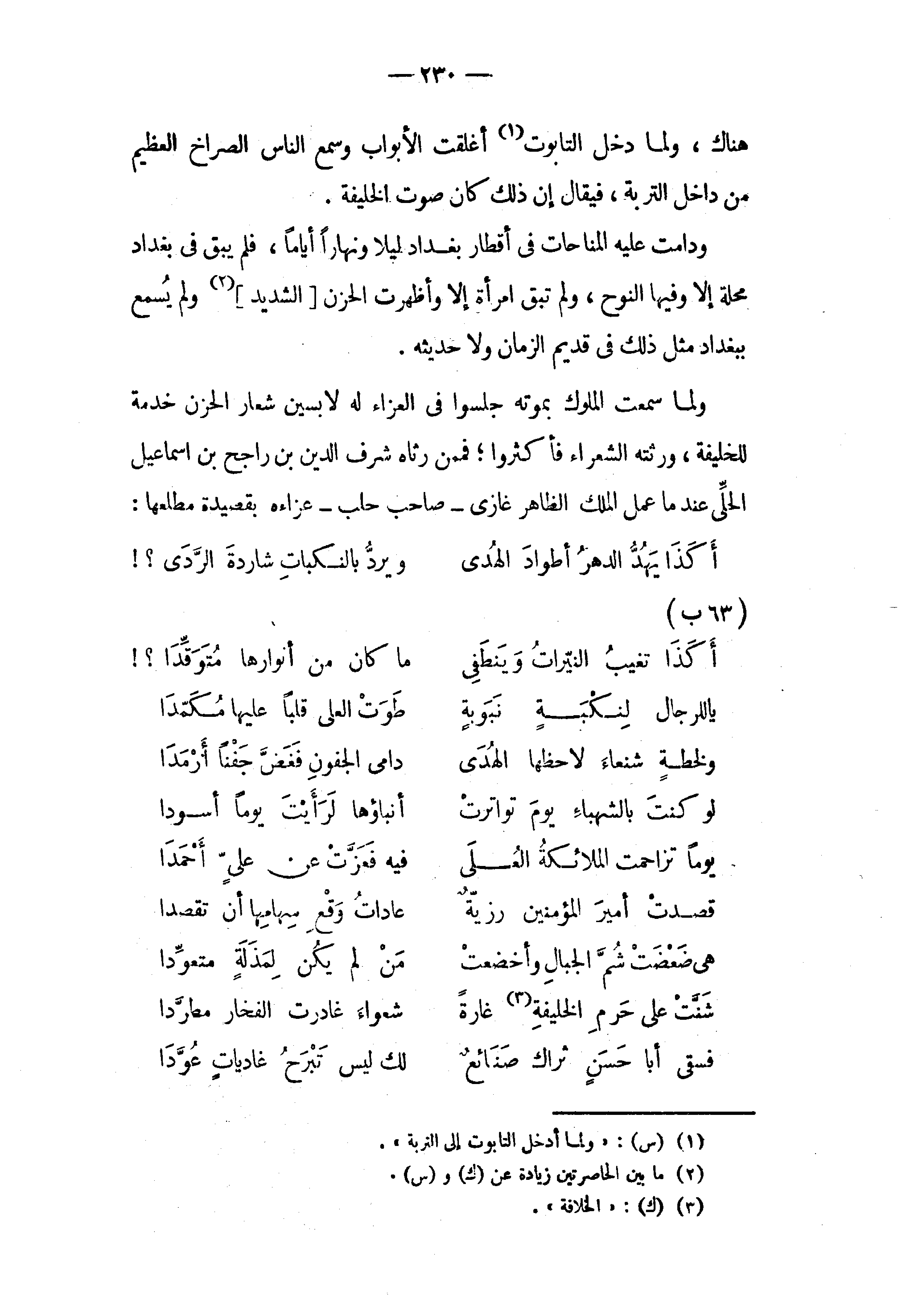 ودامت عليه المناحات في أقطار بغداد ليلا ونهارا أياما، فلم يبق في بغداد محلة إلا وفيها النوح، ولم تبق امرأة إلا وأظهرت الحزن [الشديد] (¬2) ولم يسمع ببغداد مثل ذلك في قديم الزمان ولا حديثه.