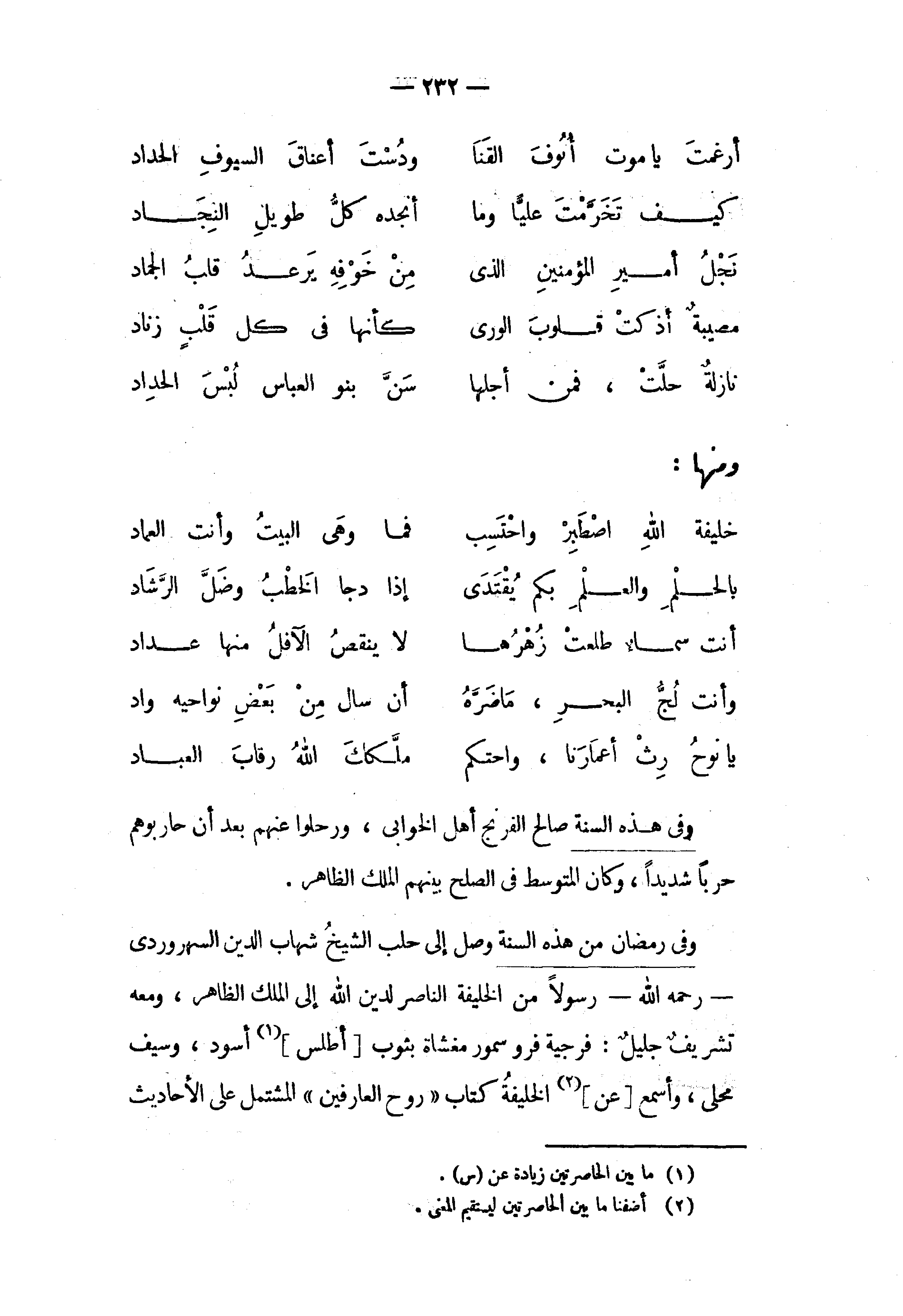 وفى رمضان من هذه السنة وصل إلى حلب الشيخ شهاب الدين السهروردى - رحمه الله - رسولا من الخليفة الناصر لدين الله إلى الملك الظاهر، ومعه تشريف جليل: فرجية فرو سمور مغشاة بثوب [أطلس] (¬1) أسود، وسيف محلى، وأسمع [عن] (¬2) الخليفة كتاب «روح العارفين» المشتمل على الأحاديث