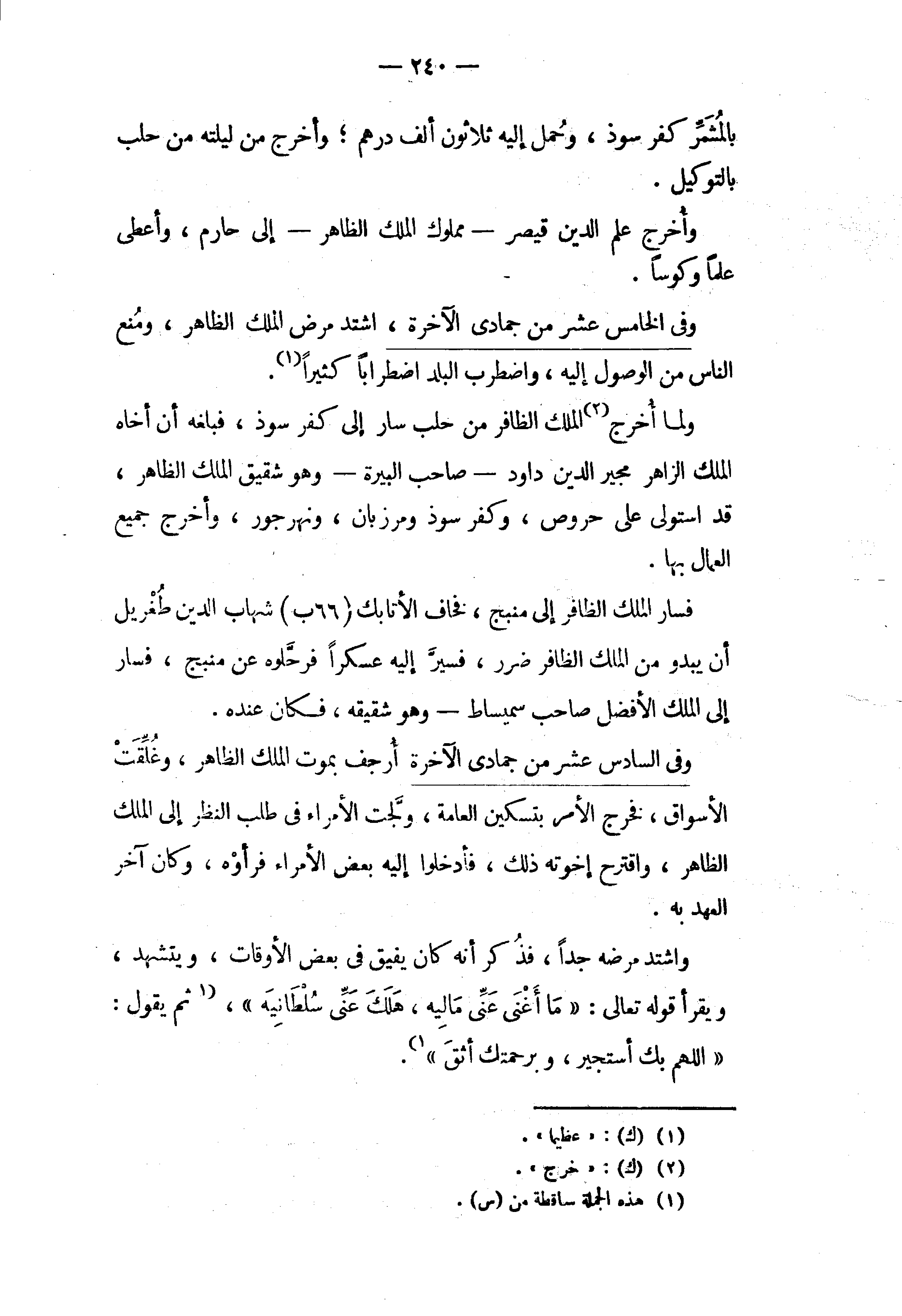 وفى السادس عشر من جمادى الآخرة أرجف بموت الملك الظاهر، وغلقت الأسواق، فخرج الأمر بتسكين العامة، ولجّت الأمراء في طلب النظر إلى الملك الظاهر، واقترح إخوته ذلك، فأدخلوا إليه بعض الأمراء فرأؤه، وكان آخر العهد به.