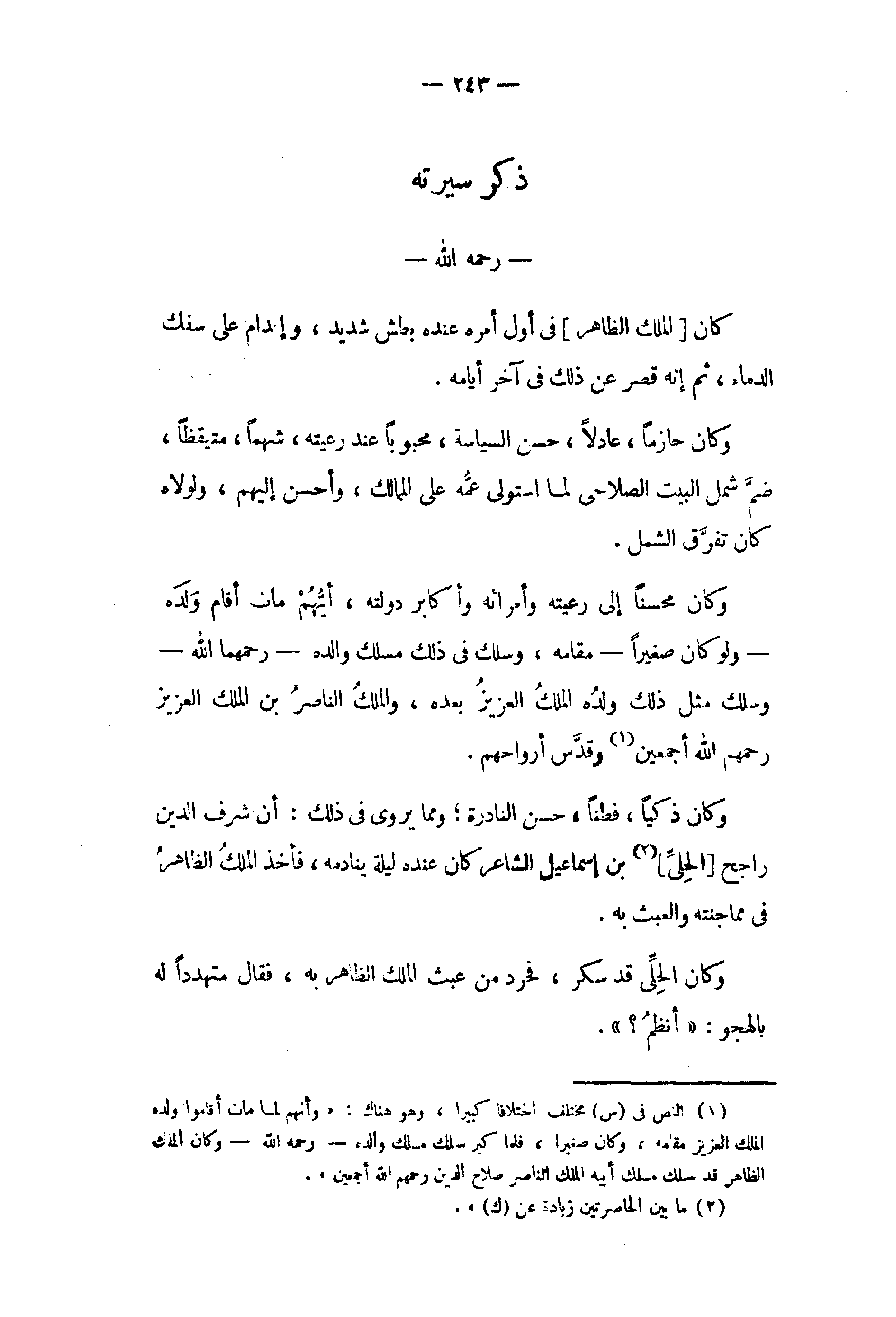 وكان محسنا إلى رعيته وأمرائه وأكابر دولته، أيّهم مات أقام ولده - ولو كان صغيرا - مقامه، وسلك في ذلك مسلك والده - رحمهما الله - وسلك مثل ذلك ولده الملك العزيز بعده، والملك الناصر بن الملك العزيز رحمهم الله أجمعين (¬1) وقدّس أرواحهم.