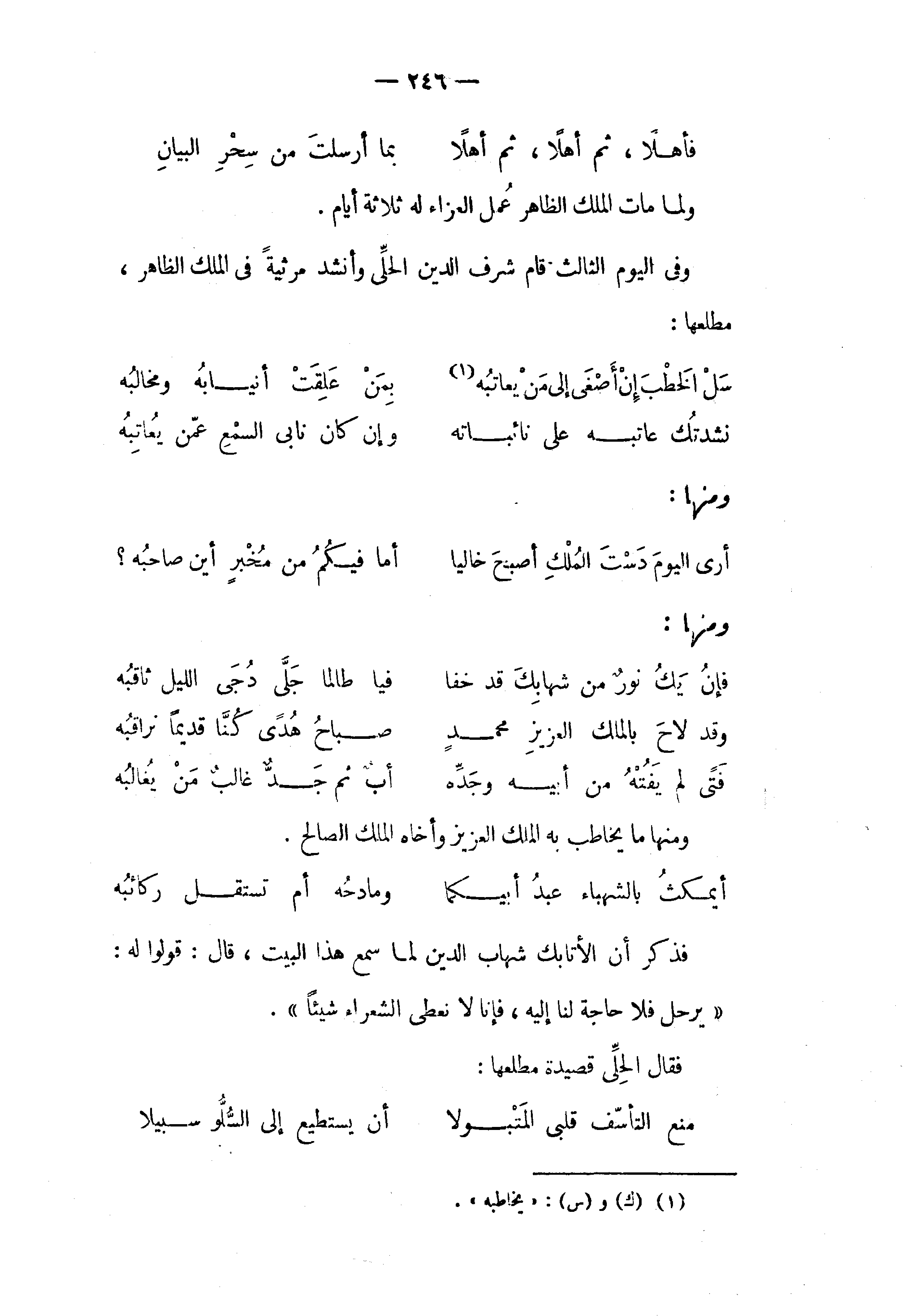 وفى اليوم الثالث قام شرف الدين الحلّى وأنشد مرثية في الملك الظاهر، مطلعها: