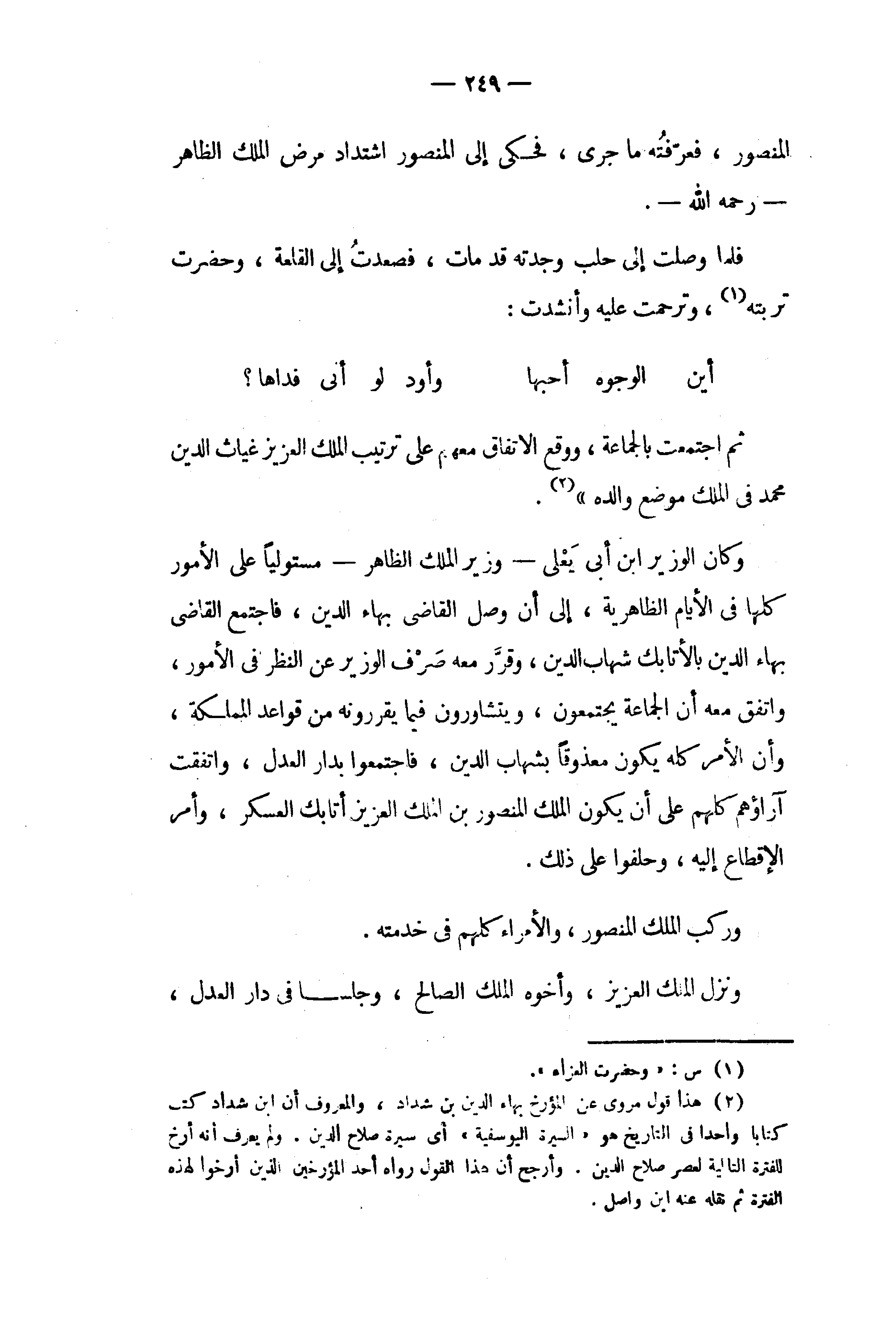 (¬2) هذا قول مروى عن المؤرخ بهاء الدين بن شداد، والمعروف أن ابن شداد كتب كتابا واحدا في التاريخ هو «السيرة اليوسفية» أي سيرة صلاح الدين. ولم يعرف أنه أرخ للفترة التالية لعصر صلاح الدين. وأرجح أن هذا القول رواه أحد المؤرخين الذين أرخوا لهذه الفترة ثم نقله عنه ابن واصل.