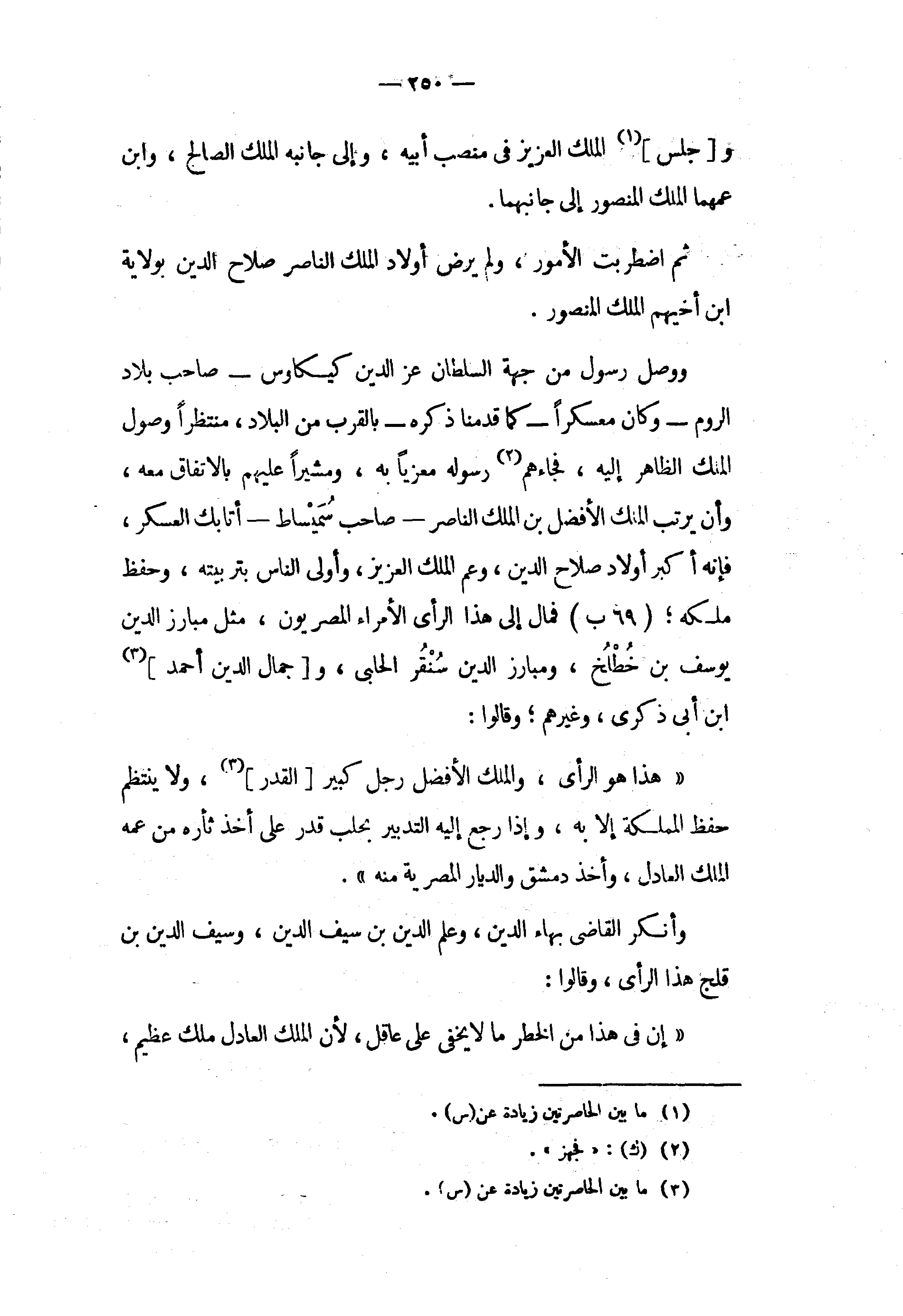 ووصل رسول من جهة السلطان عز الدين كيكاوس - صاحب بلاد الروم - وكان معسكرا - كما قدمنا ذكره - بالقرب من البلاد، منتظرا وصول الملك الظاهر إليه، فجاءهم (¬2) رسوله معزيا به، ومشيرا عليهم بالاتفاق معه، وأن يرتب الملك الأفضل بن الملك الناصر - صاحب سميساط - أتابك العسكر، فإنه أكبر أولاد صلاح الدين، وعم الملك العزيز، وأولى الناس بتربيته، وحفظ ملكه؛ (69 ب) فمال إلى هذا الرأى الأمراء المصريون، مثل مبارز الدين يوسف بن خطلخ، ومبارز الدين سنقر الحلبى، و [جمال الدين أحمد] (3) ابن أبى ذكرى، وغيرهم؛ وقالوا: