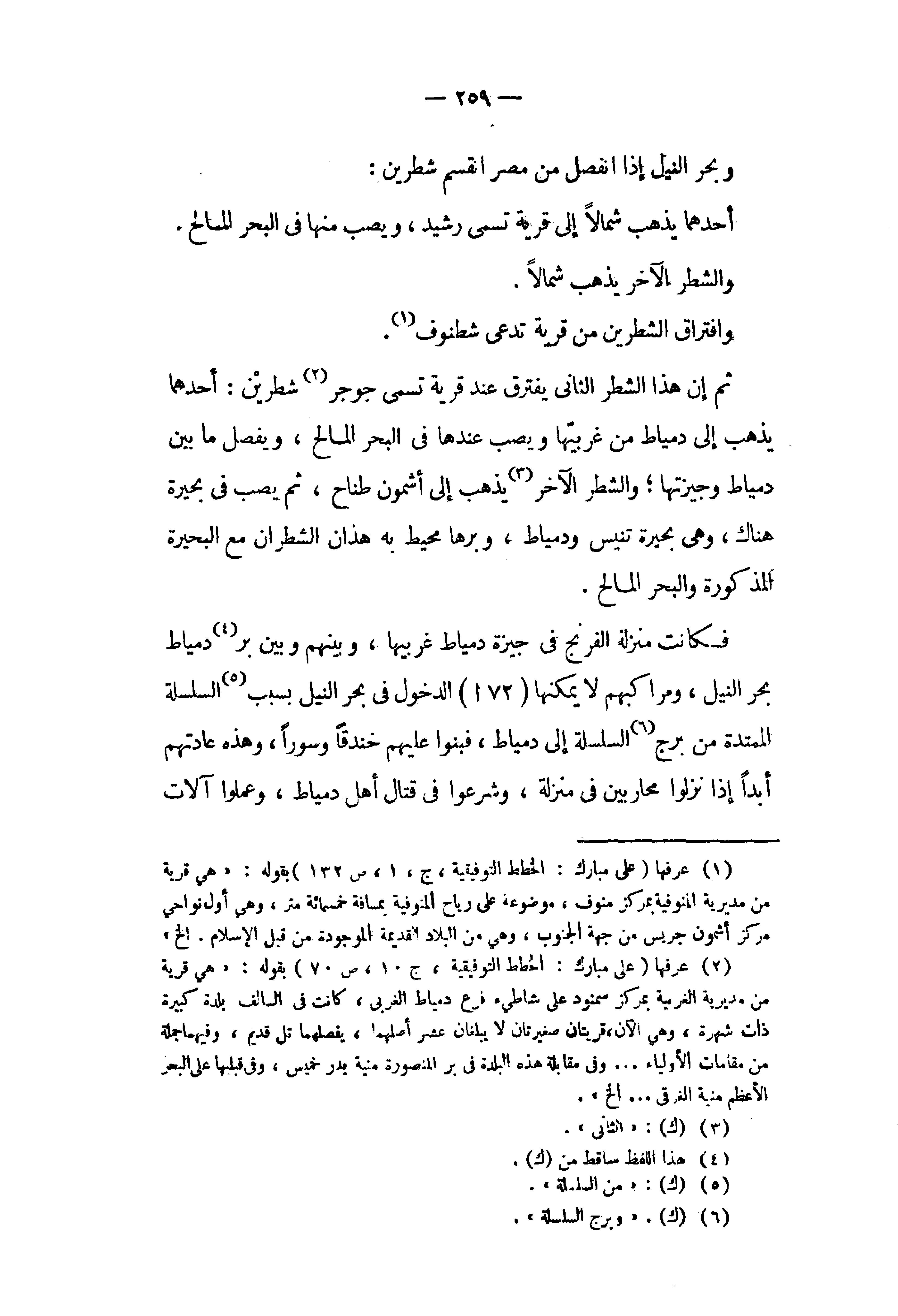 ثم إن هذا الشطر الثانى يفترق عند قرية تسمى جوجر (¬2) شطرين: أحدهما يذهب إلى دمياط من غربيّها ويصب عندها في البحر المالح، ويفصل ما بين دمياط وجيزتها؛ والشطر الآخر (¬3) يذهب إلى أشمون طناح، ثم يصب في بحيرة هناك، وهى بحيرة تنيس ودمياط، وبرها محيط به هذان الشطران مع البحيرة المذكورة والبحر المالح.