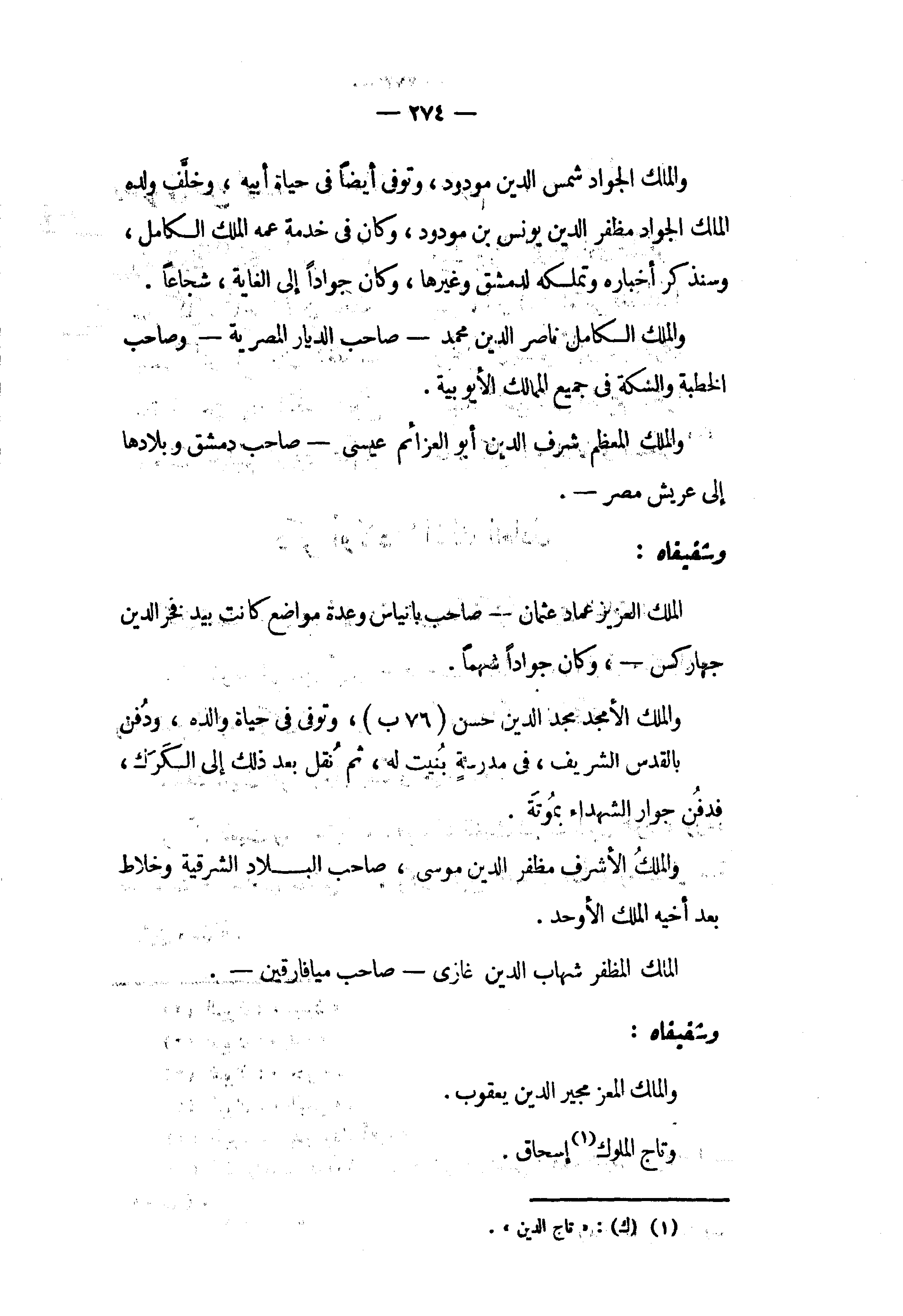 والملك الجواد شمس الدين مودود، وتوفى أيضا في حياة أبيه، وخلّف ولده الملك الجواد مظفر الدين يونس بن مودود، وكان في خدمة عمه الملك الكامل، وسنذكر أخباره وتملكه لدمشق وغيرها، وكان جوادا إلى الغاية، شجاعا.