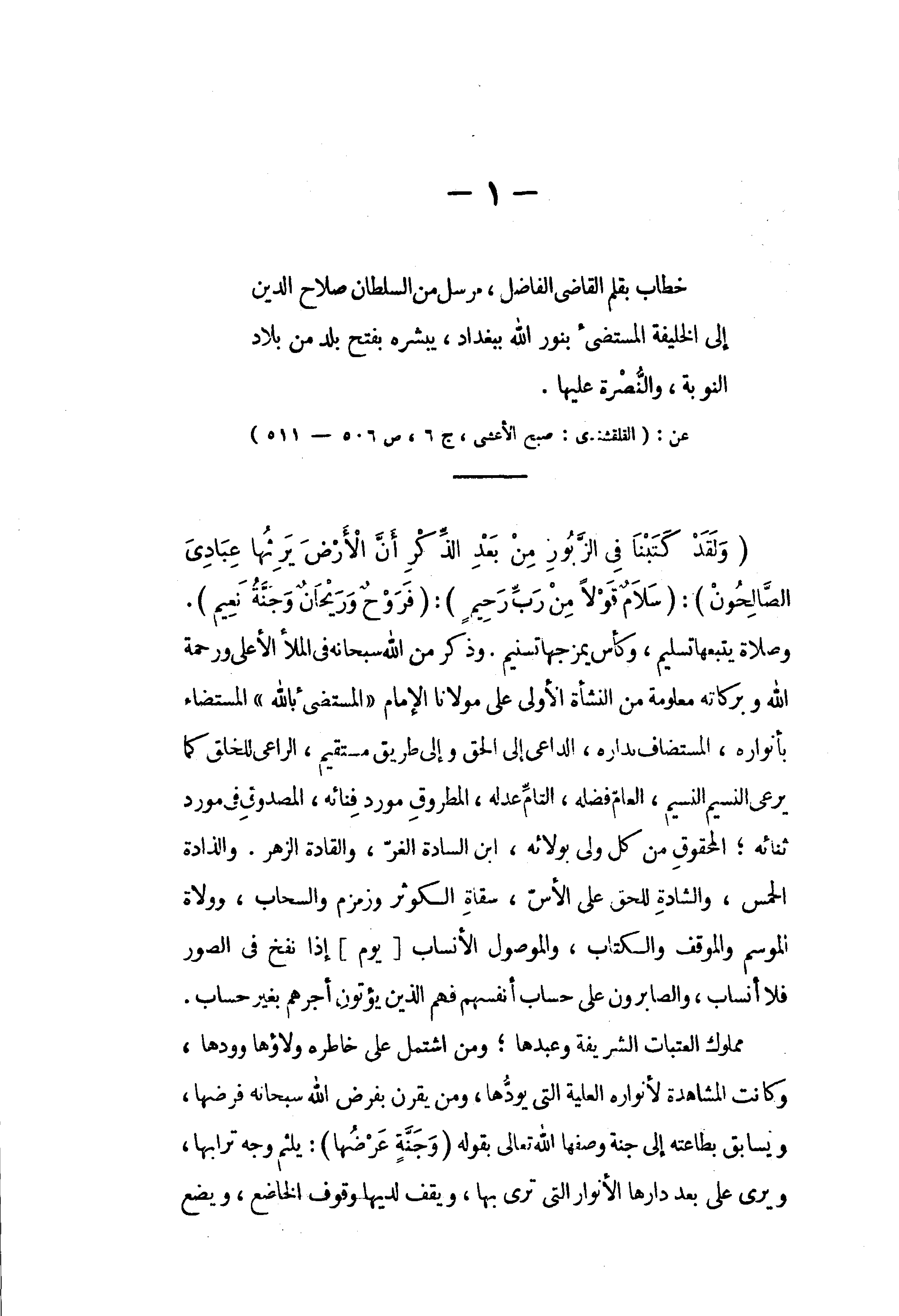 خطاب بقلم القاضى الفاضل، مرسل من السلطان صلاح الدين إلى الخليفة المستضىء بنور الله ببغداد، يبشره بفتح بلد من بلاد النوبة، والنّصرة عليها