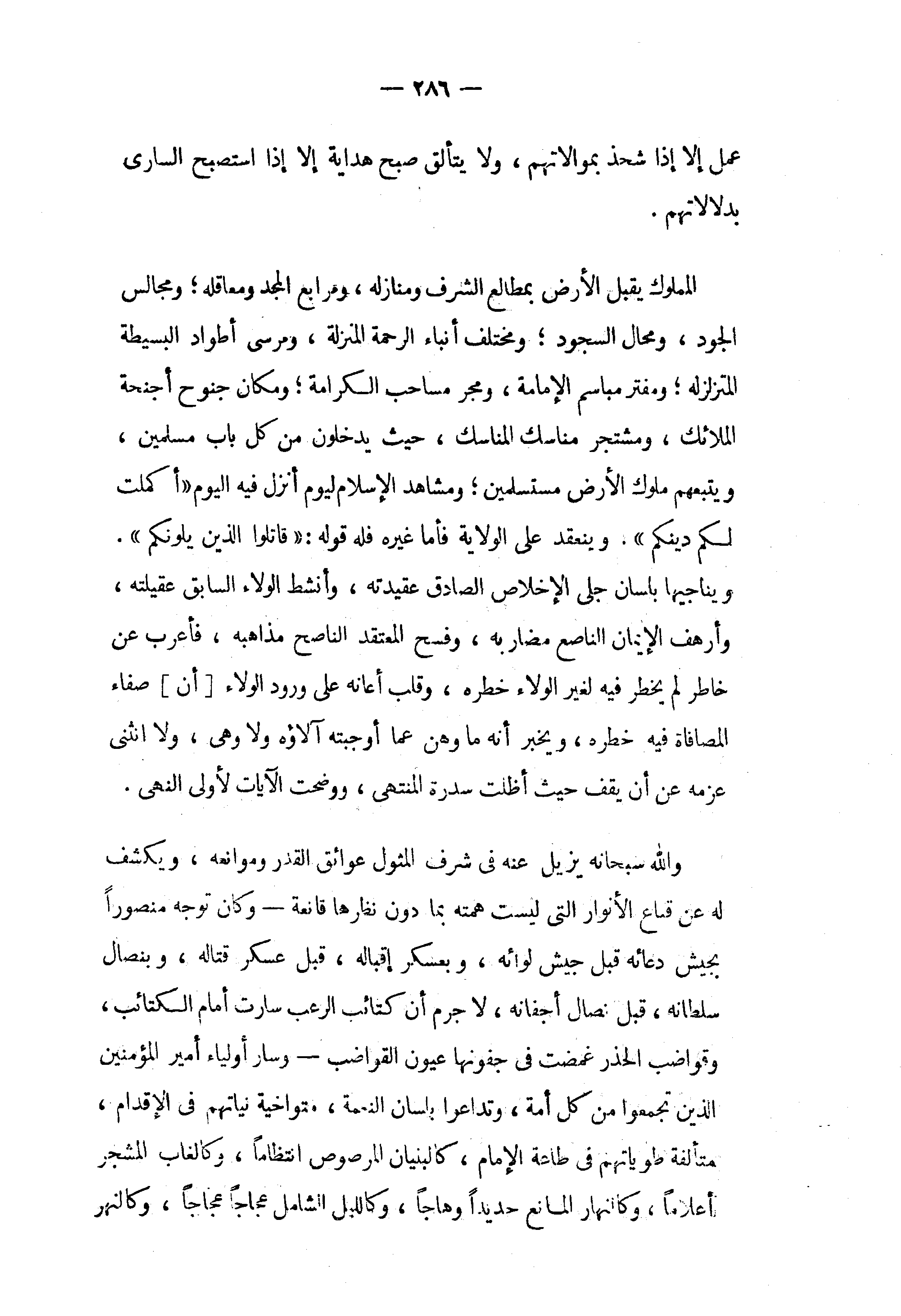 المملوك يقبل الأرض بمطالع الشرف ومنازله، ومرابع المجد ومعاقله؛ ومجالس الجود، ومحال السجود؛ ومختلف أنباء الرحمة المنزلة، ومرسى أطواد البسيطة المتزلزله؛ ومفتر مباسم الإمامة، ومجر مساحب الكرامة؛ ومكان جنوح أجنحة الملائك، ومشتجر مناسك المناسك، حيث يدخلون من كل باب مسلمين، ويتبعهم ملوك الأرض مستسلمين؛ ومشاهد الإسلام ليوم أنزل فيه اليوم «أكملت لكم دينكم». وينعقد على الولاية فأما غيره فله قوله: «قاتلوا الذين يلونكم».