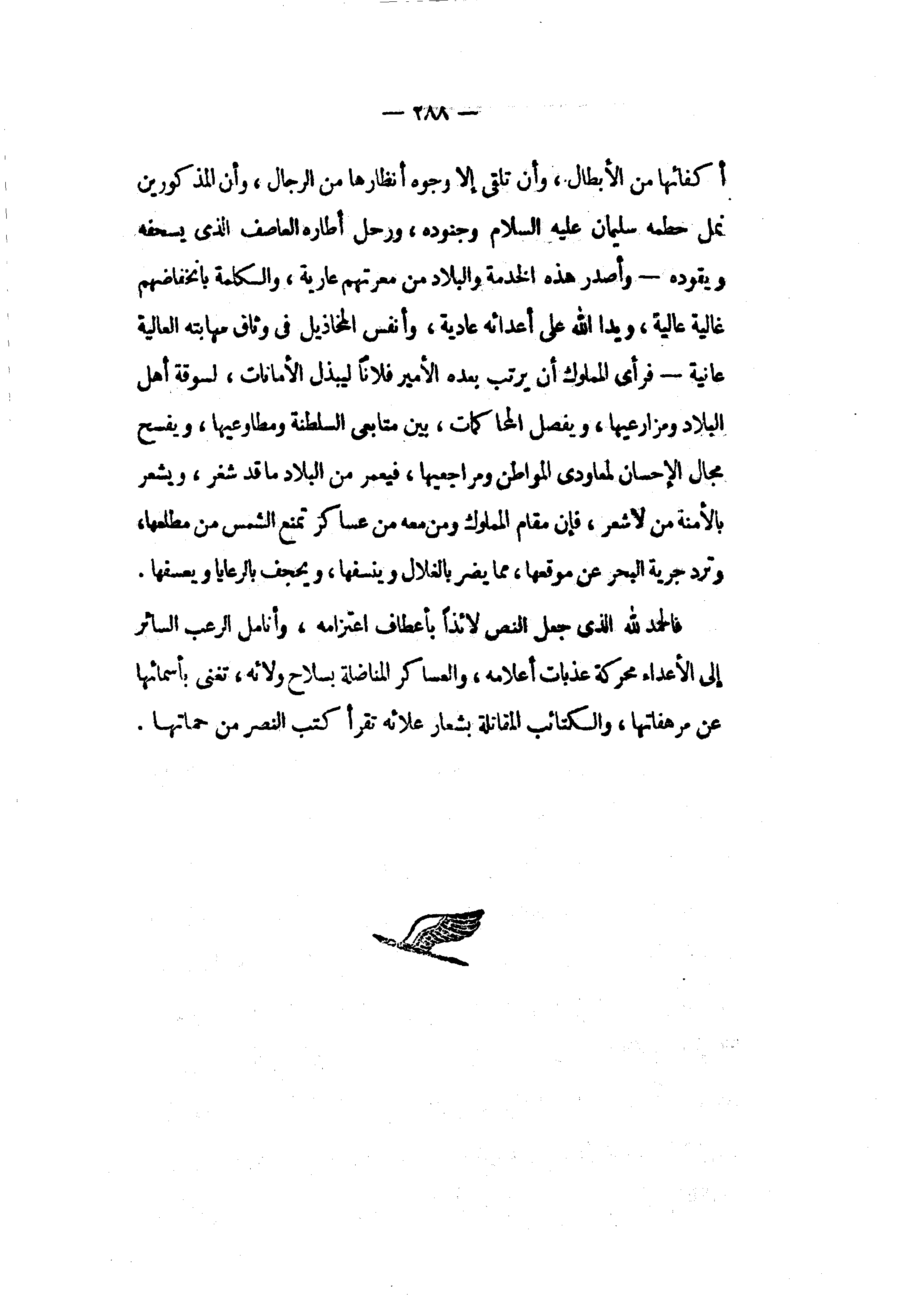 فالحمد لله الذى جعل النص لائذا بأعطاف اعتزامه، وأنامل الرعب السائر إلى الأعداء محركة عذبات أعلامه، والعساكر المناضلة بسلاح ولائه، تغنى بأسمائها عن مرهفاتها، والكتائب المقاتلة بشعار علائه تقرأ كتب النصر من حماتها.