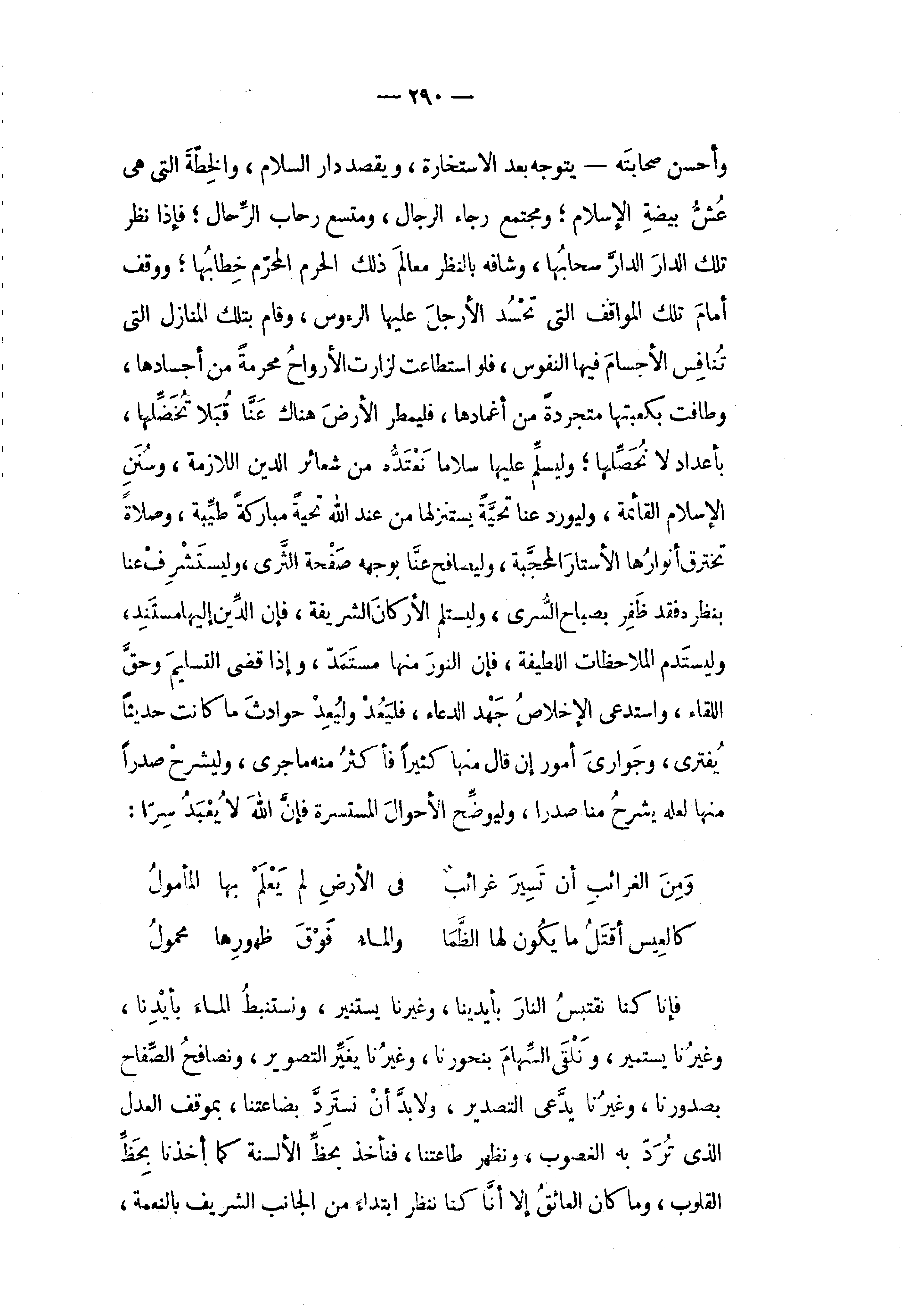 وأحسن صحابته - يتوجه بعد الاستخارة، ويقصد دار السلام، والخطّة التي هى عشّ بيضة الإسلام؛ ومجتمع رجاء الرجال، ومتسع رحاب الرّحال؛ فإذا نظر تلك الدار الدارّ سحابها، وشافه بالنظر معالم ذلك الحرم المحرّم خطابها؛ ووقف أمام تلك المواقف التي تحسد الأرجل عليها الرءوس، وقام بتلك المنازل التي تنافس الأجسام فيها النفوس، فلو استطاعت لزارت الأرواح محرمة من أجسادها، وطافت بكعبتها متجردة من أغمادها، فليمطر الأرض هناك عنّا قبلا تخضّلها، بأعداد لا نحصّلها؛ وليسلّم عليها سلاما نعتدّه من شعائر الدين اللازمة، وسنن الإسلام القائمة، وليورد عنا تحيّة يستنزلها من عند الله تحية مباركة طيّبة، وصلاة تخترق أنوارها الأستار المحجّبة، وليصافح عنّا بوجهه صفحة الثّرى، وليستشرف عنا بنظره فقد ظفر بصباح السّرى، وليستلم الأركان الشريفة، فإن الدّين إليها مستند، وليستدم الملاحظات اللطيفة، فإن النور منها مستمدّ، وإذا قضى التسليم وحقّ اللقاء، واستدعى الإخلاص جهد الدعاء، فليعد وليعد حوادث ما كانت حديثا يفترى، وجوارى أمور إن قال منها كثيرا فأكثر منه ما جرى، وليشرح صدرا منها لعله يشرح منا صدرا، وليوضّح الأحوال المستسرة فإنّ الله لا يعبد سرّا: