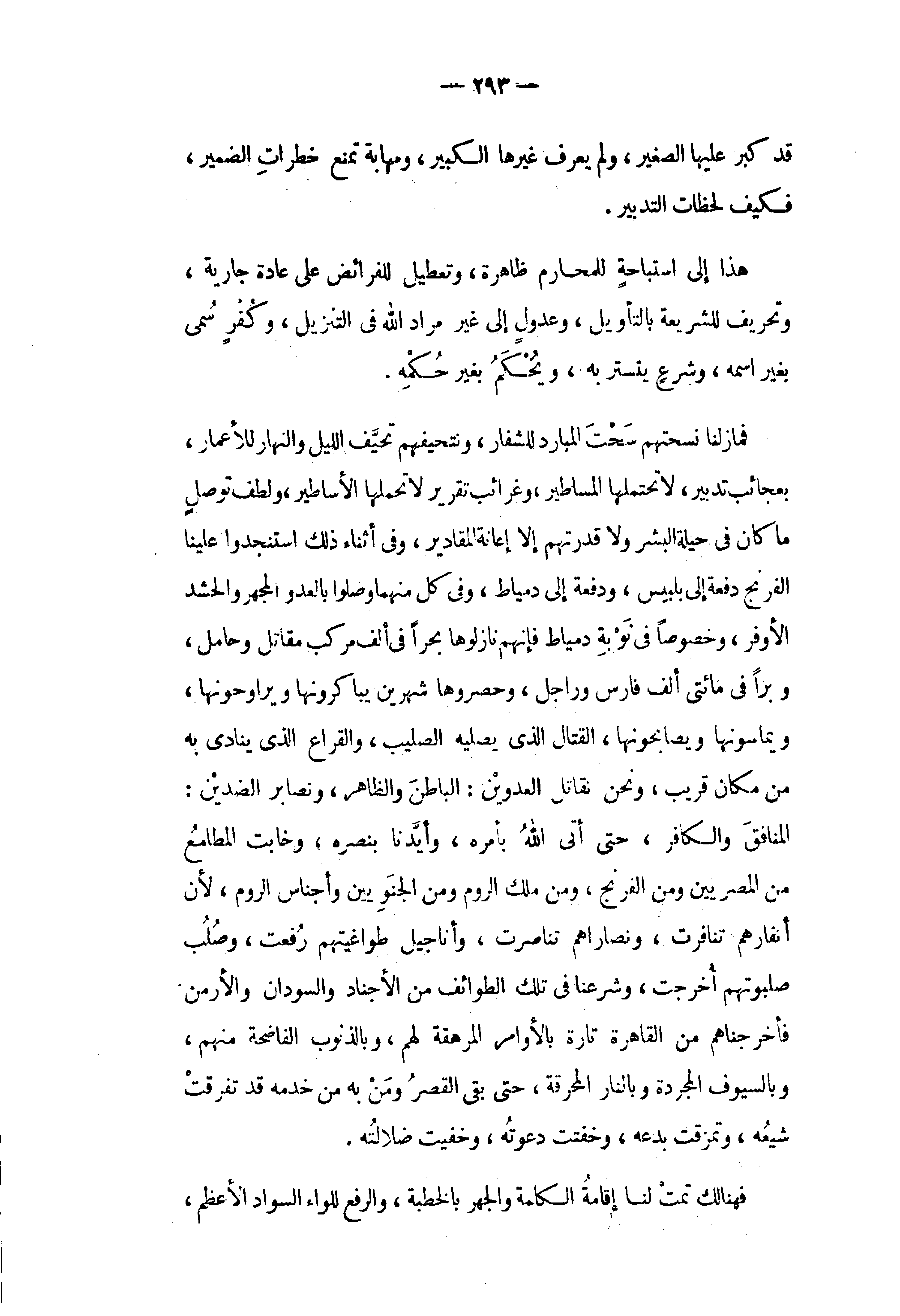 المنافق والكافر، حتى أتى الله بأمره، وأيّدنا بنصره، وخابت المطامع من المصريين ومن الفرنج، ومن ملك الروم ومن الجنويين وأجناس الروم، لأن أنفارهم تنافرت، ونصاراهم تناصرت، وأناجيل طواغيتهم رفعت، وصلب صلبوتهم أخرجت، وشرعنا في تلك الطوائف من الأجناد والسودان والأرمن فأخرجناهم من القاهرة تارة بالأوامر المرهقة لهم، وبالذنوب الفاضحة منهم، وبالسيوف المجردة وبالنار المحرقة، حتى بقى القصر ومن به من خدمه قد تفرقت شيعه، وتمزقت بدعه، وخفتت دعوته، وخفيت ضلالته.
