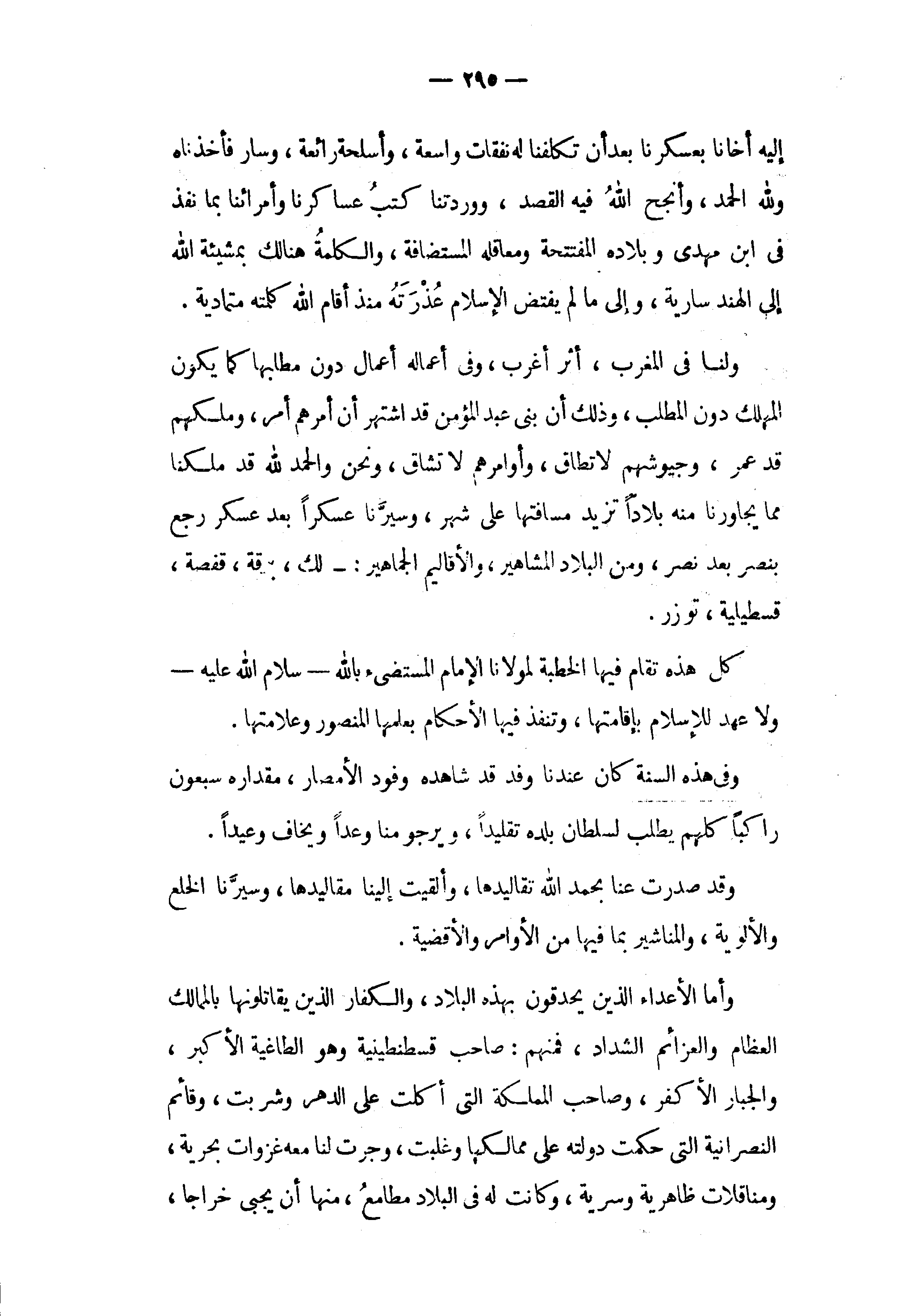 وأما الأعداء الذين يحدقون بهذه البلاد، والكفار الذين يقاتلونها بالممالك العظام والعزائم الشداد، فمنهم: صاحب قسطنطينية وهو الطاغية الأكبر، والجبار الأكفر، وصاحب المملكة التي أكلت على الدهر وشربت، وقائم النصرانية التي حكمت دولته على ممالكها وغلبت، وجرت لنا معه غزوات بحرية، ومناقلات ظاهرية وسرية، وكانت له في البلاد مطامع، منها أن يجبى خراجا،