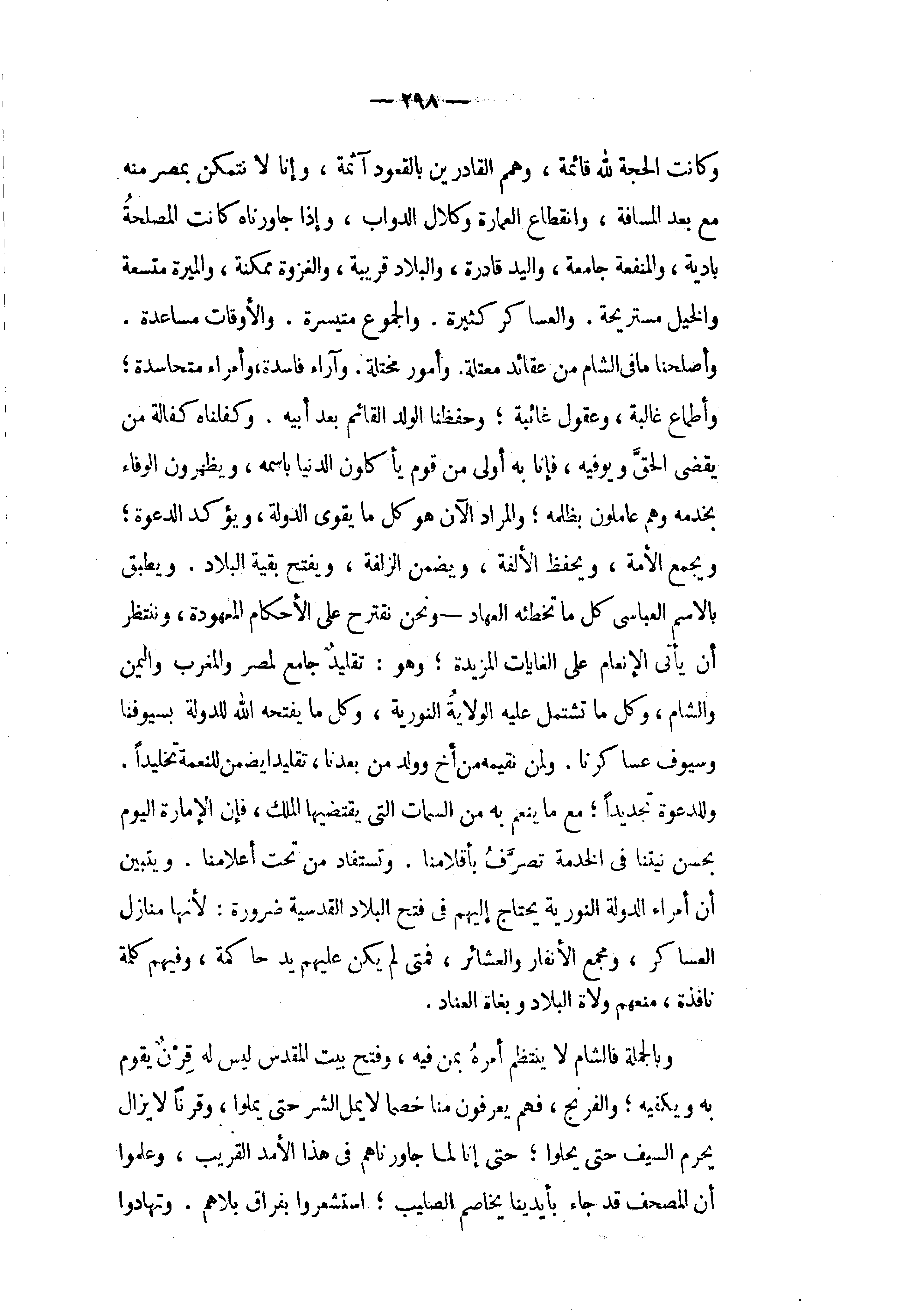 وللدعوة تجديدا؛ مع ما ينعم به من السمات التي يقتضيها الملك، فإن الإمارة اليوم بحسن نيتنا في الخدمة تصرّف بأقلامنا. وتستفاد من تحت أعلامنا. ويتبين أن أمراء الدولة النورية يحتاج إليهم في فتح البلاد القدسية ضرورة: لأنها منازل العساكر، ومجمع الأنفار والعشائر، فمتى لم يكن عليهم يد حاكمة، وفيهم كلمة نافذة، منعهم ولاة البلاد وبغاة العناد.