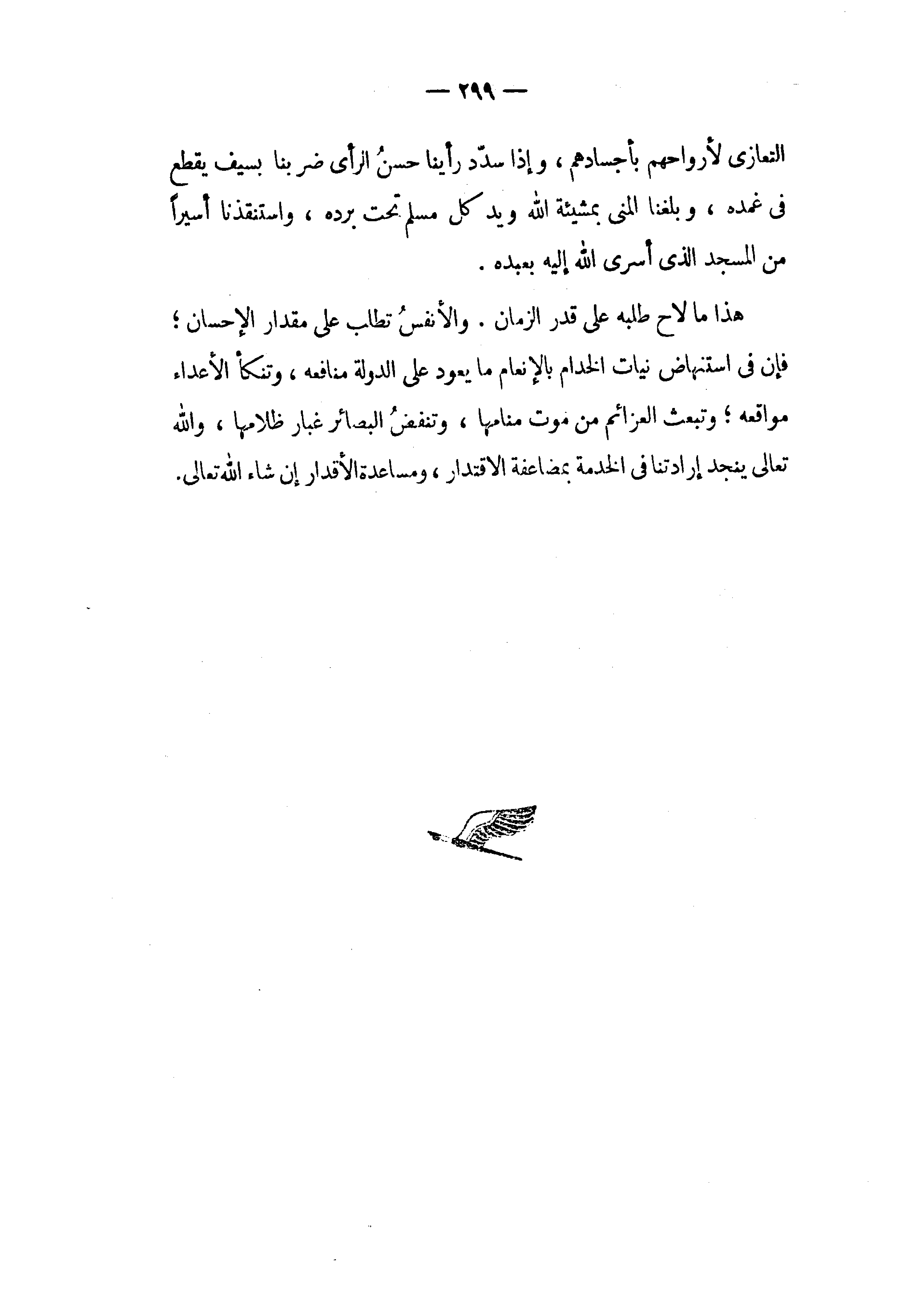 هذا ما لاح طلبه على قدر الزمان. والأنفس تطلب على مقدار الإحسان؛ فإن في استنهاض نيات الخدام بالإنعام ما يعود على الدولة منافعه، وتنكأ الأعداء مواقعه؛ وتبعث العزائم من موت منامها، وتنفض البصائر غبار ظلامها، والله تعالى ينجد إرادتنا في الخدمة بمضاعفة الاقتدار، ومساعدة الأقدار إن شاء الله تعالى.