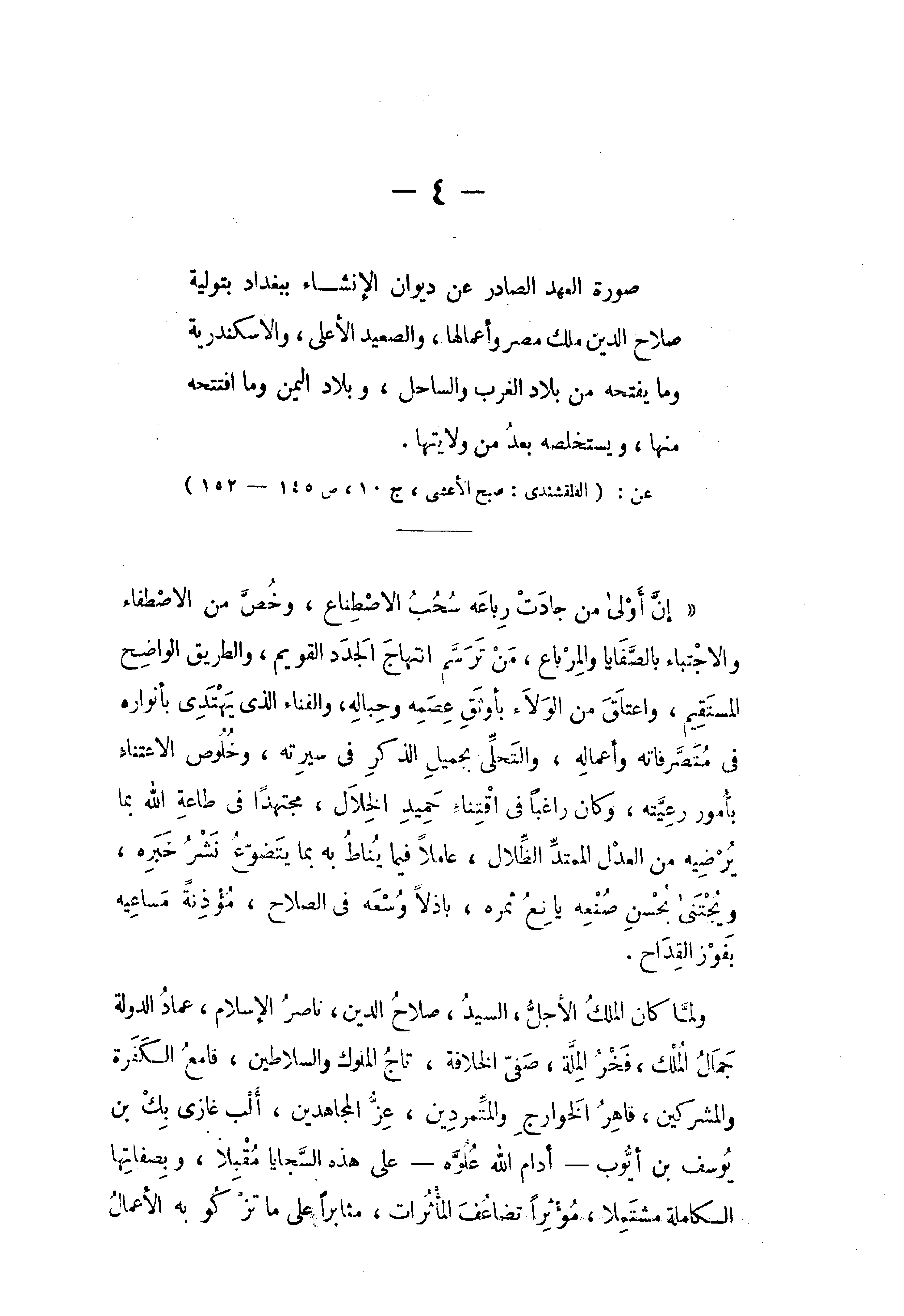 صورة العهد الصادر عن ديوان الإنشاء ببغداد بتولية صلاح الدين ملك مصر وأعمالها، والصعيد الأعلى، والاسكندرية وما يفتحه من بلاد الغرب والساحل، وبلاد اليمن وما افتتحه منها، ويستخلصه بعد من ولايتها