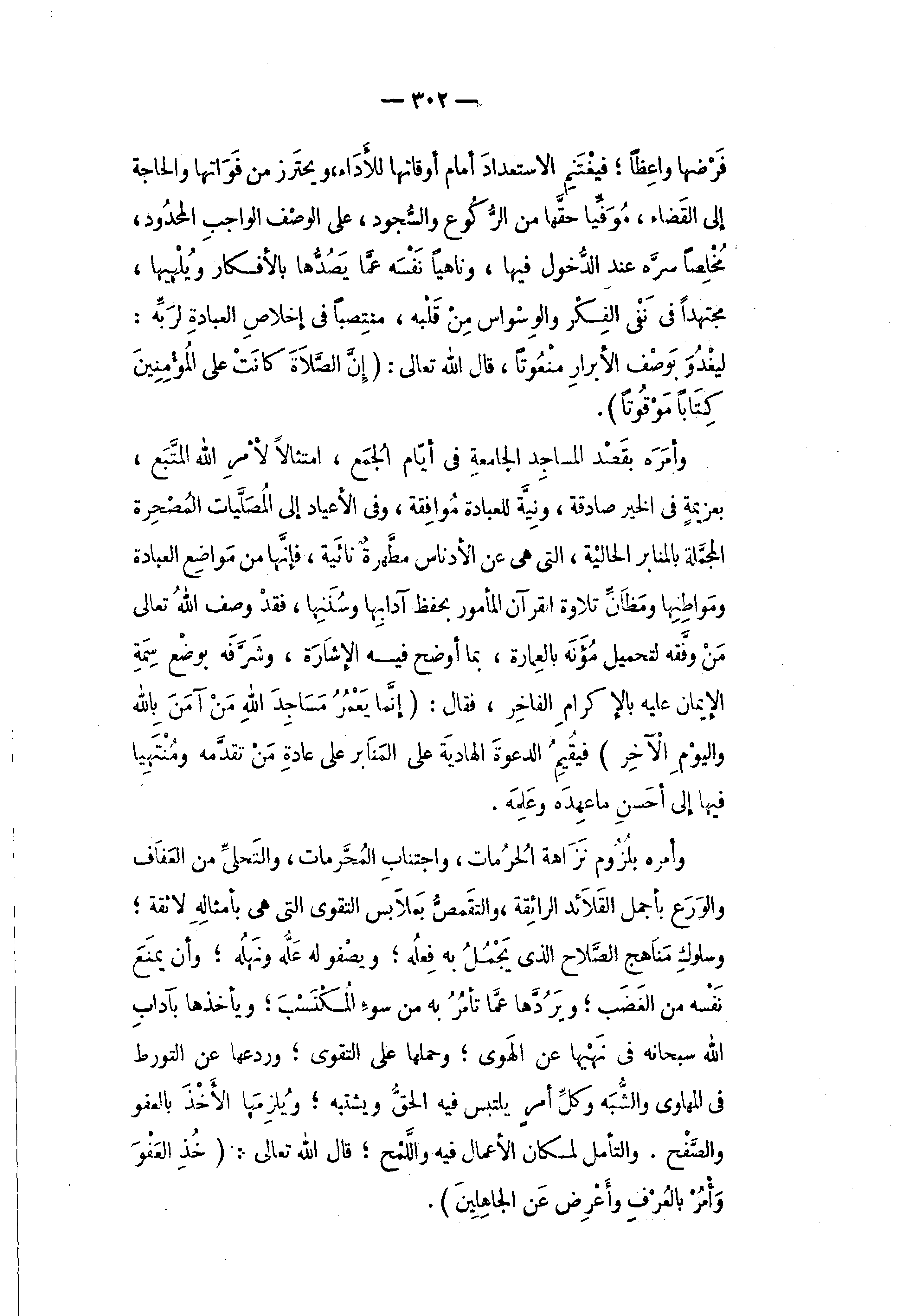 وأمره بقصد المساجد الجامعة في أيّام الجمع، امتثالا لأمر الله المتّبع، بعزيمة في الخير صادقة، ونيّة للعبادة موافقة، وفى الأعياد إلى المصلّيات المصحرة المجمّلة بالمنابر الحالية، التي هى عن الأدناس مطّهرة نائية، فإنّها من مواضع العبادة ومواطنها ومظانّ تلاوة القرآن المأمور بحفظ آدابها وسننها، فقد وصف الله تعالى من وفّقه لتحميل مؤنه بالعمارة، بما أوضح فيه الإشارة، وشرّفه بوضع سمة الإيمان عليه بالإكرام الفاخر، فقال: ({إِنَّما يَعْمُرُ مَساجِدَ اللهِ مَنْ آمَنَ بِاللهِ وَالْيَوْمِ الْآخِرِ)} فيقيم الدعوة الهادية على المنابر على عادة من تقدّمه ومنتهيا فيها إلى أحسن ما عهده وعلمه.
